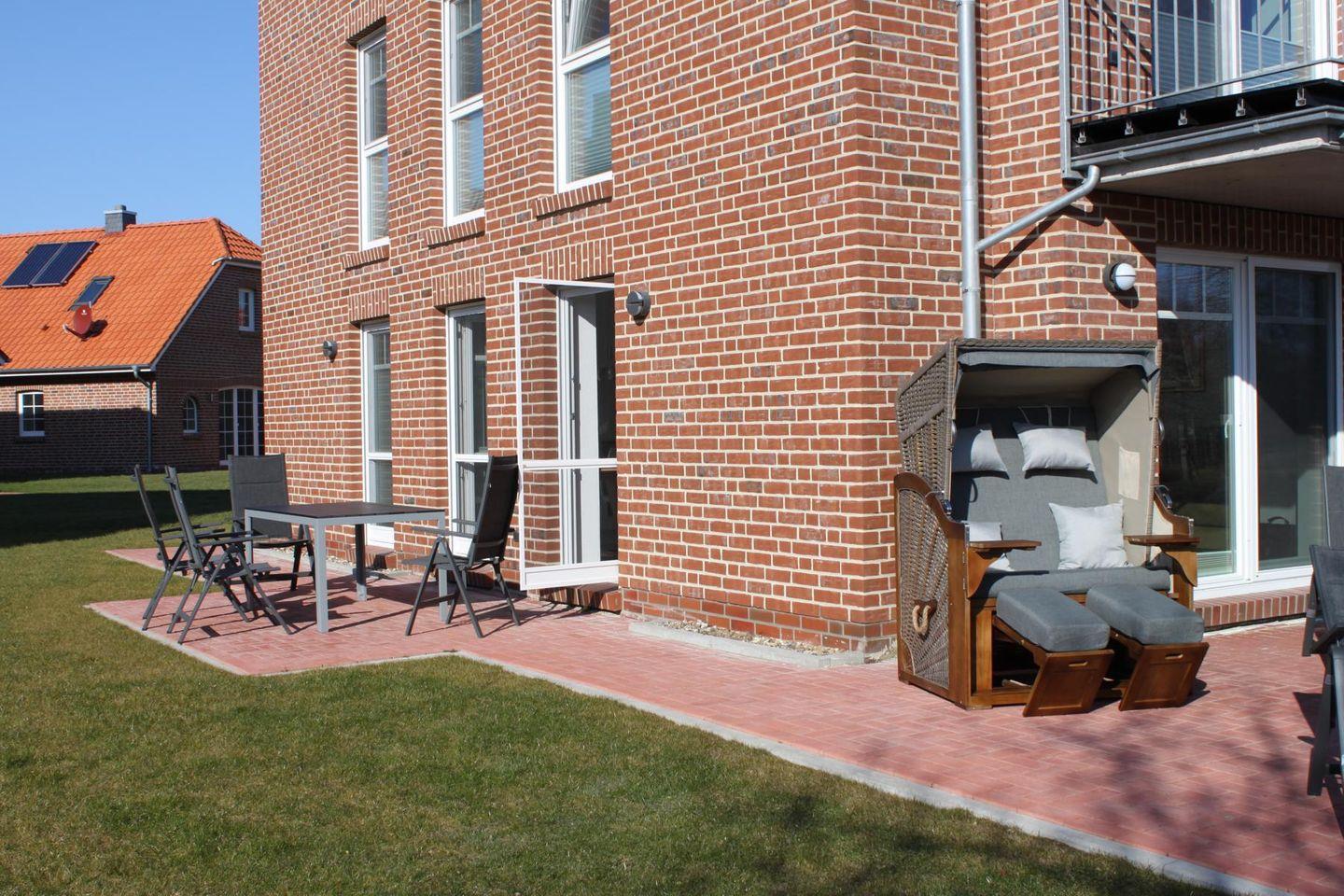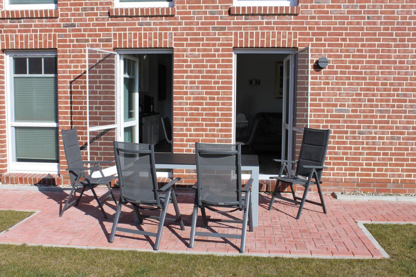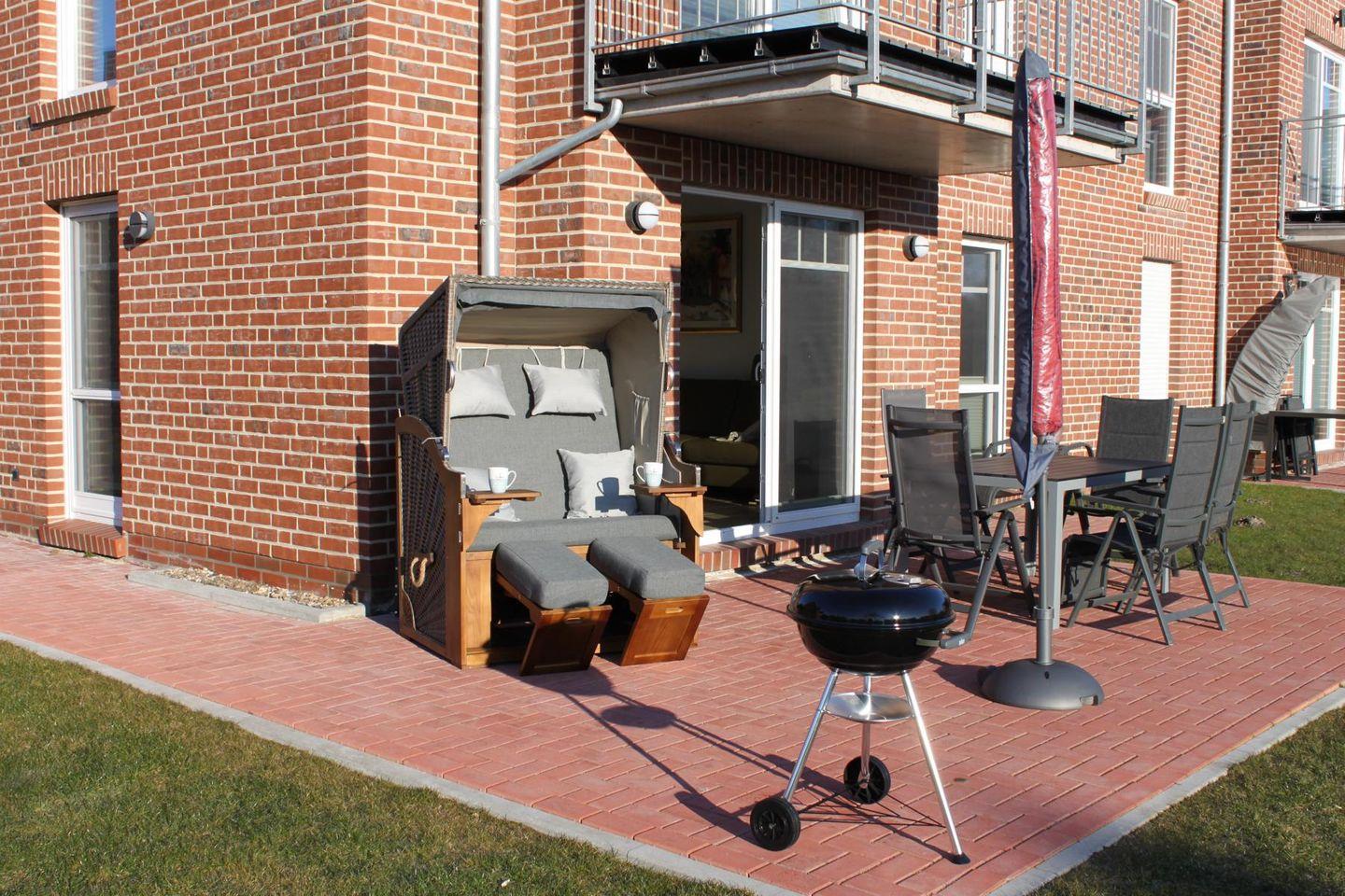 Die Wohnung verfügt über vier Gartenstühle, einen Gartentisch, zwei Sonnenliegen, Sonnenschirm, Strandkorb und zwei Terrassen. Außerdem ist ein Kugelholzkohlegrill vorhanden. Ab Februar 2024 ist der Garten nun auch eingezäunt und seit März 2024 ist die große Terrasse mit einer Überdachung versehen.