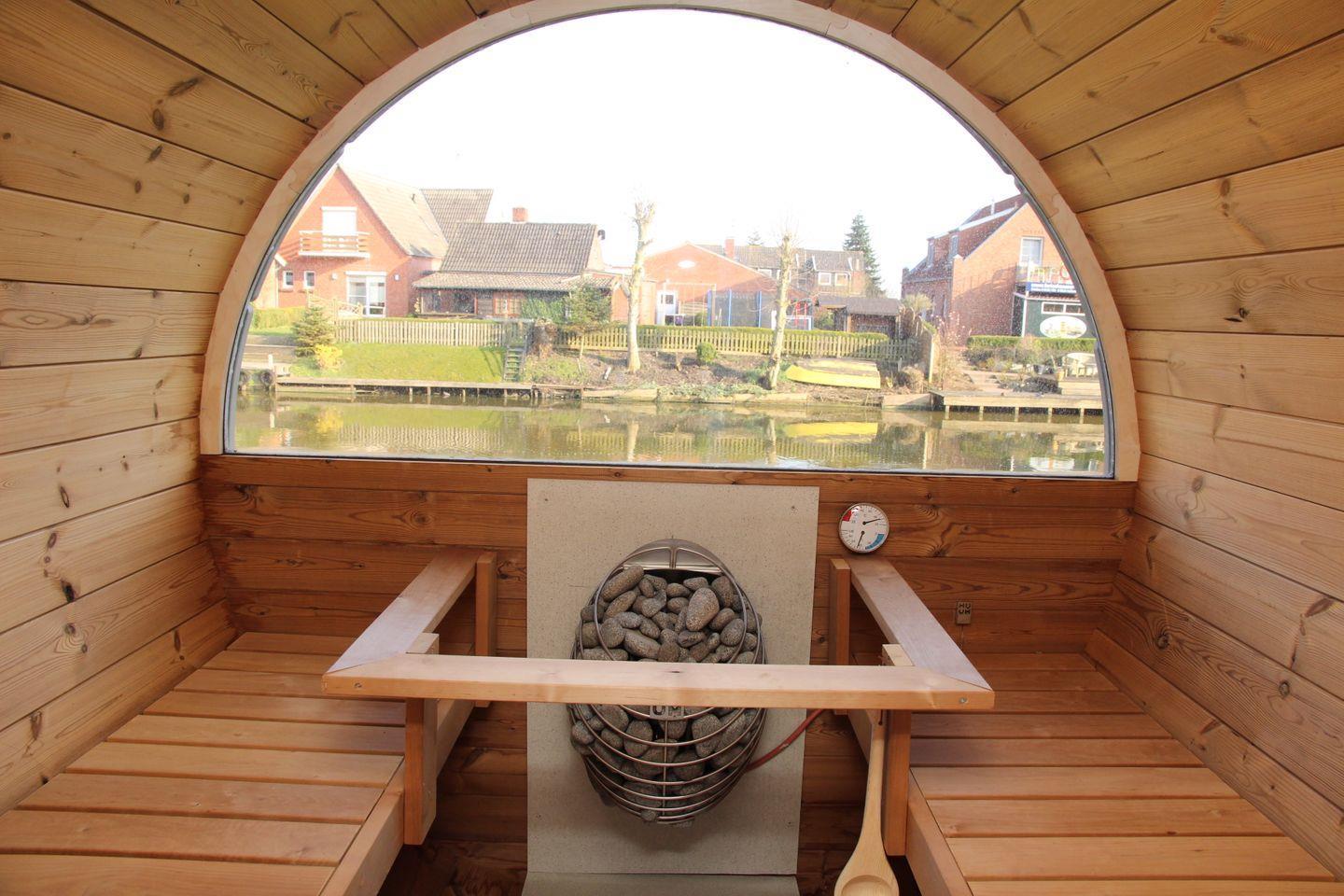 Die große und möblierte Terrasse lädt zu zahlreichen Sonnenstunden sein und bietet dazu das wahre Highlight der Wohnung: Eine Fasssauna mit freiem Blick auf das Wasser! Die Gartenfläche ist auch eingezäunt.