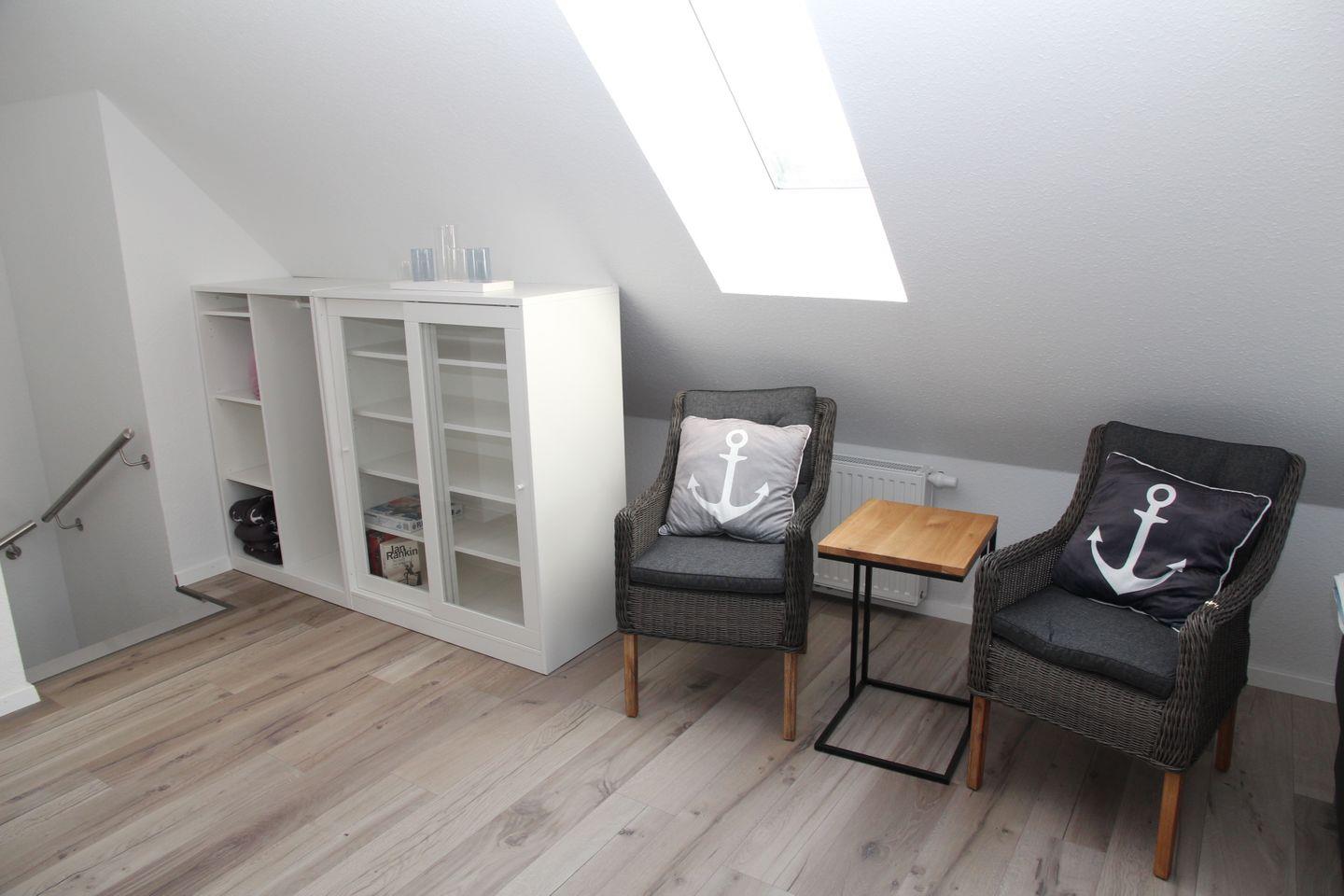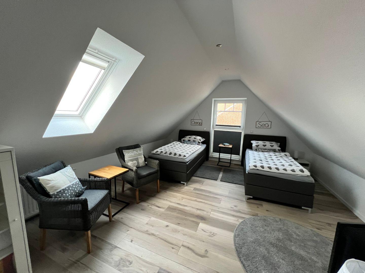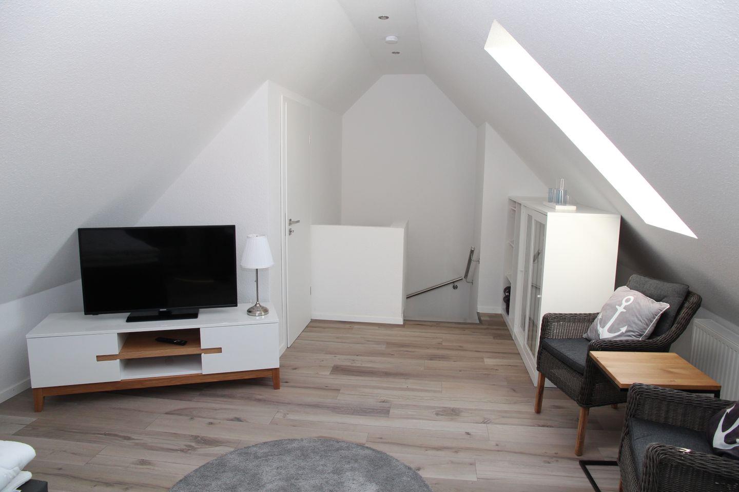 Im Dachgeschoss befindet sich das Studio mit zwei Einzelbetten, einem weiteren Flachbildfernseher und zwei zusätzlichen Sitzmöglichkeiten.