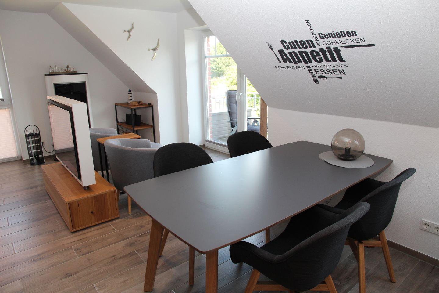 Diese hochwertig und mit viel Liebe eingerichtete Wohnung bietet einen traumhaften Blick auf das Greetsieler Sieltief. Der großzügige Wohnbereich mit L-Sofa, großem Flachbildfernseher und elektrischem Kamin lädt zu gemütlichen Stunden ein. Zwei weitere Sessel bieten einen wunderschönen Ausblick auf das Wasser, ideal um ein Buch zu lesen oder einfach nur zum Seele baumeln lassen. Von hier aus können Sie auch auf den möblierten Balkon mit Sonnenschirm raustreten.