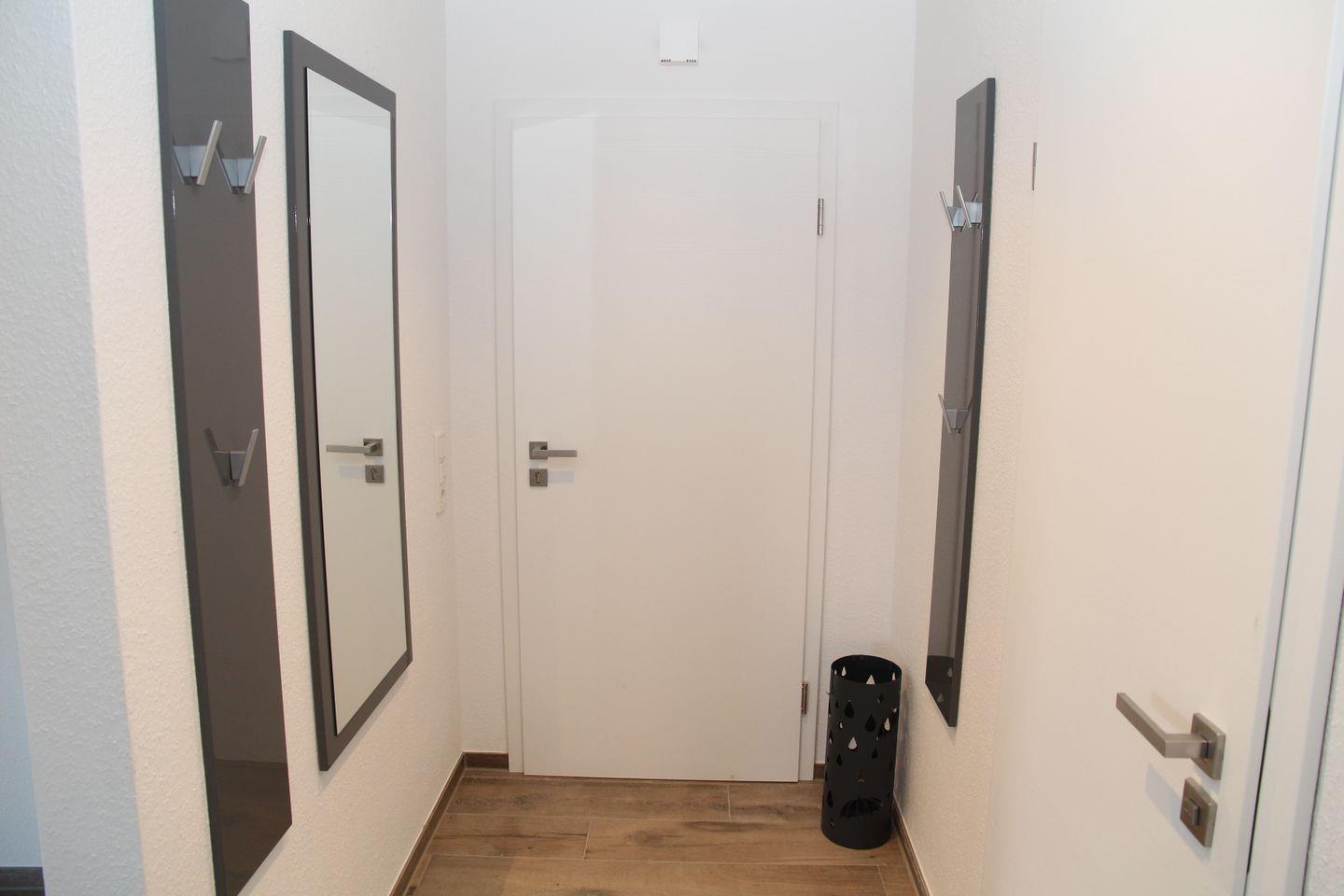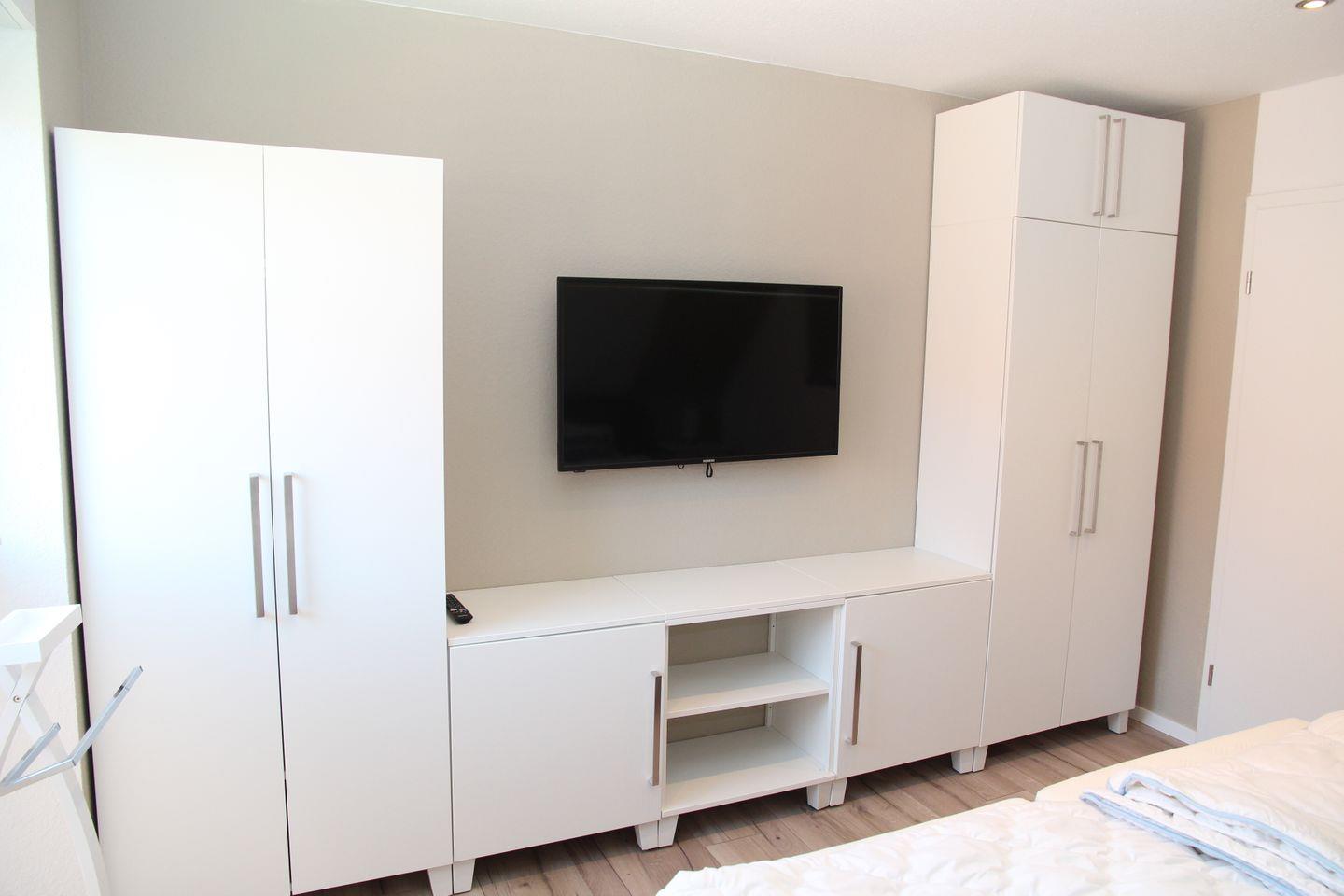Ebenfalls auf dieser Etage befindet sich ein Schlafzimmer mit einem Doppelbett, einem weiteren Flachbildfernseher und großzügigen Verstaumöglichkeiten für Ihr Gepäck. Nebenan befindet sich das Duschbad mit ebenerdiger Dusche und tiefem Einstieg.