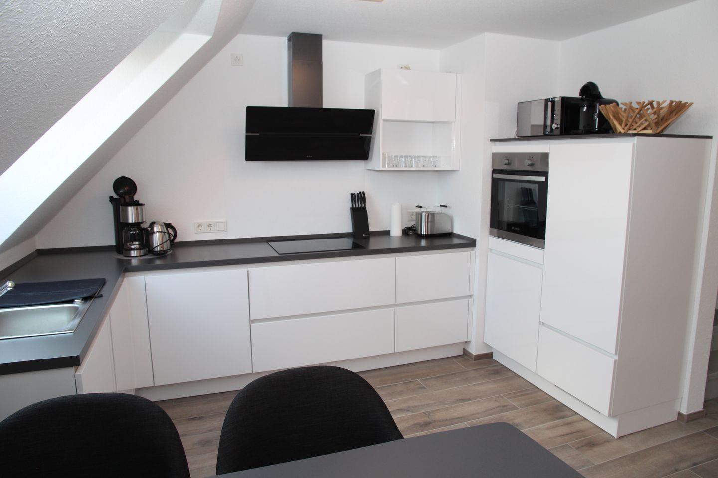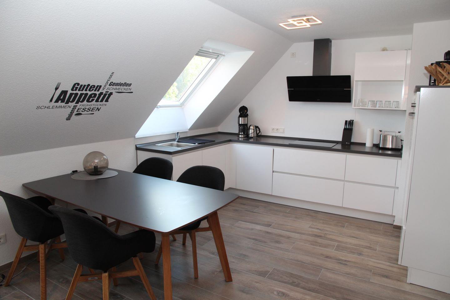 Angrenzend befindet sich der Essbereich mit Esstisch und vier Stühlen und die Küche. Diese ist mit hochwertigen Geräten und Materialien ausgestattet und bietet unter anderem einen Kühlschrank mit Gefrierfach, einen Backofen auf Arbeitshöhe, einen Induktionsherd, eine Mikrowelle, eine Kaffeemaschine, einen Wasserkocher, einen Toaster und eine Tassimo-Kaffeemaschine.