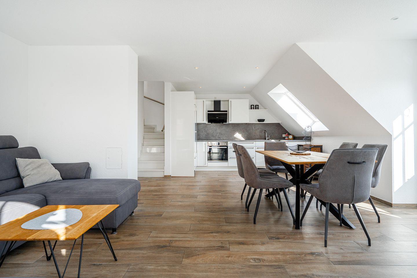 Übergehend befindet sich der Essbereich mit Esstisch, sechs Stühlen und die Küche. Diese ist mit hochwertigen Geräten und Materialien ausgestattet und bietet unter anderem einen Kühlschrank mit Gefrierfach, einen Backofen, einen Herd mit Cerankochfeld und weitere unerlässliche Küchenutensilien.