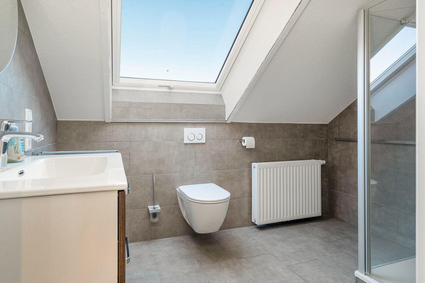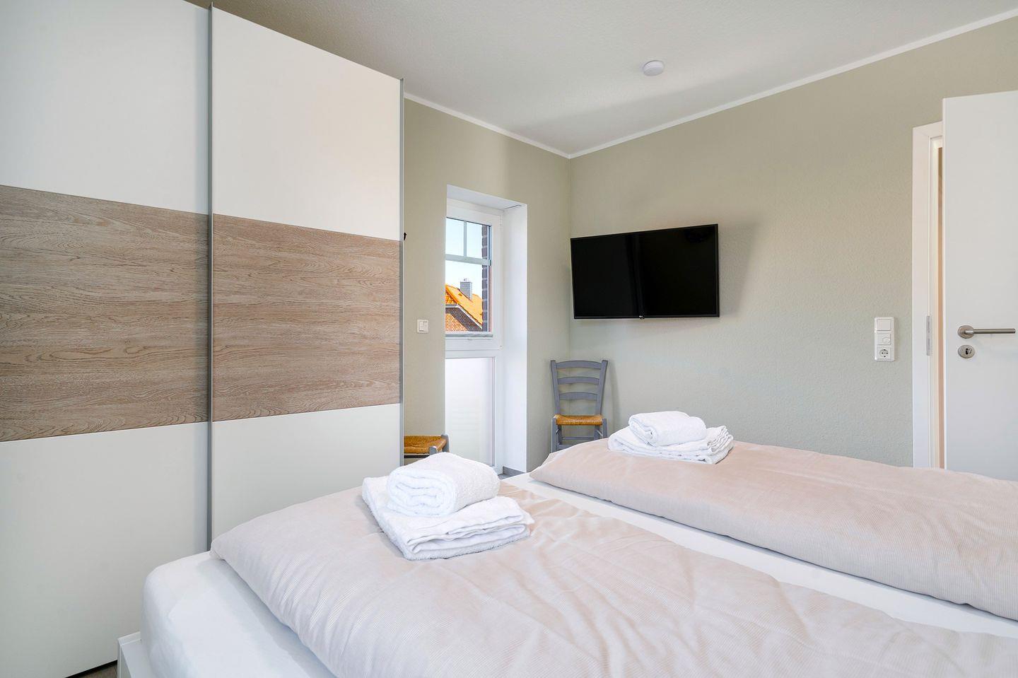 Vom Wohnbereich führt eine Treppe in das ausgebaute Dachgeschoss. Hier finden Sie ein 2. Duschbad mit Föhn, eine begehbare Kleiderkammer und das großzügige Dachstudio mit 2 Einzelbetten und ausziehbarem Schlafsofa (140x200).
