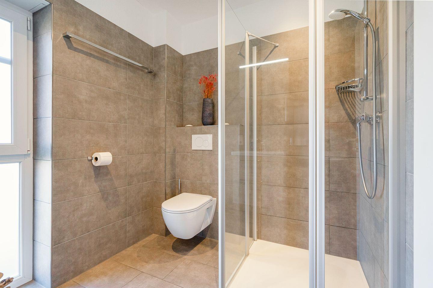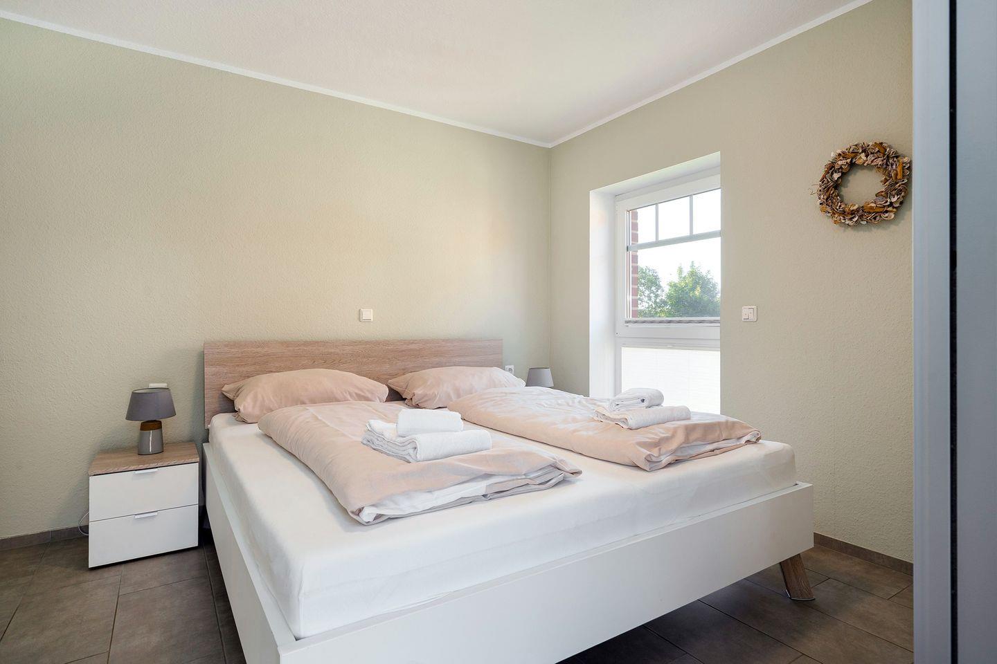 Auf gleicher Ebene befindet sich ein Schlafzimmer mit Doppelbett, Kleiderschrank und TV, ein modernes Duschbad mit Föhn und ein Abstellraum mit Waschtrockner, Bügeleisen, Bügelbrett und Wäscheständer.