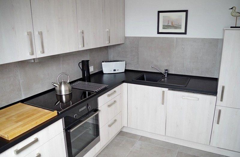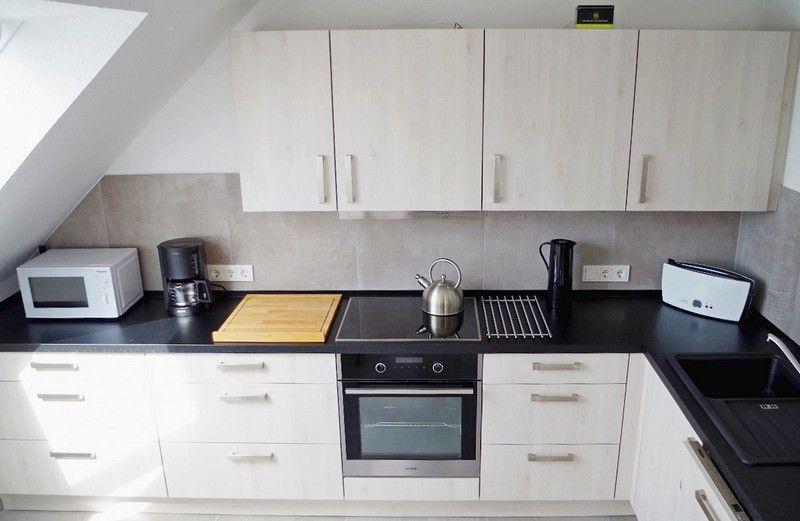 Angrenzend befindet sich die voll ausgestattete Küche mit Induktionsherd, Backofen, Kühlschrank mit Gefrierfach, Mikrowelle, Wasserkessel, Kaffeemaschine, Toaster usw. Zwei Sitzplätze laden hier zum schnellen Kaffee zwischendurch ein.