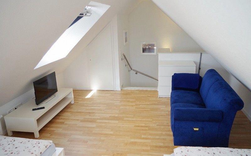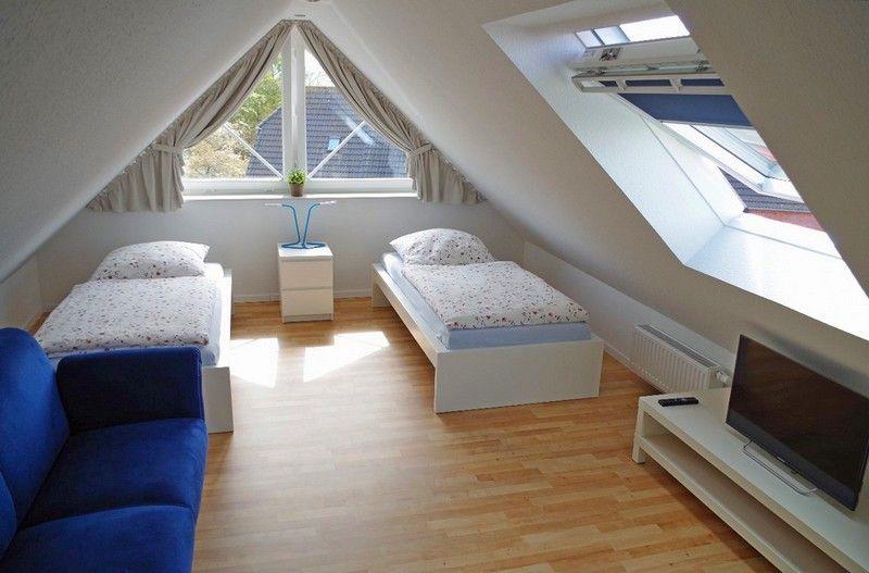 Im ausgebauten Spitzboden gibt es zwei weitere Einzelbetten. Von hier aus hat man einen schönen Blick über das Dorf. Dieses Zimmer verfügt über einen weiteren Flachbildfernseher. Das Dachfenster und das Dreiecksfenster können komplett abgedunkelt werden.