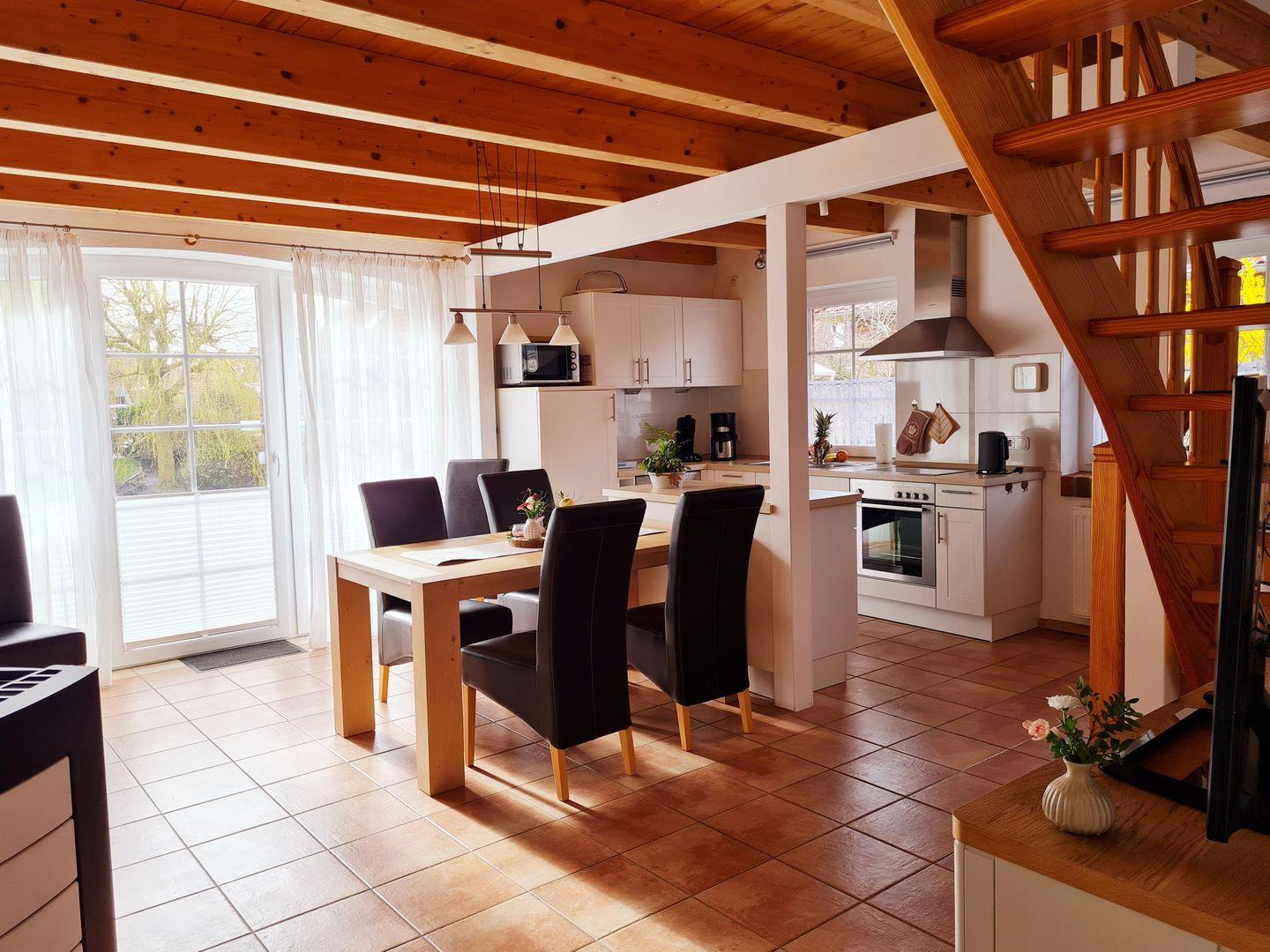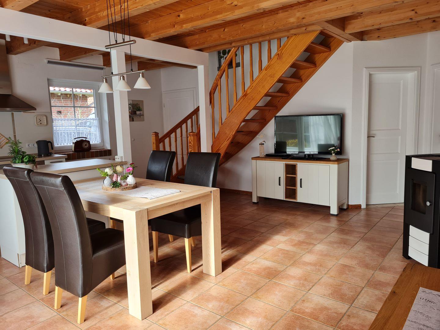 Das Erdgeschoss ist mit einer gemütlichen Holzbalkendecke versehen und verfügt über eine Fußbodenerwärmung. Hier steht Ihnen ein großzügiger Wohn-Essbereich mit angrenzender Küche zur Verfügung. Die Küche ist komplett ausgestattet. Wir halten dort einen Backofen mit Ceranfeld, eine Mikrowelle, einen Geschirrspüler, einen großen Kühlschrank mit Gefrierfach, eine Senseo Pad Maschine, eine Kaffeemaschine etc. für Sie bereit.
