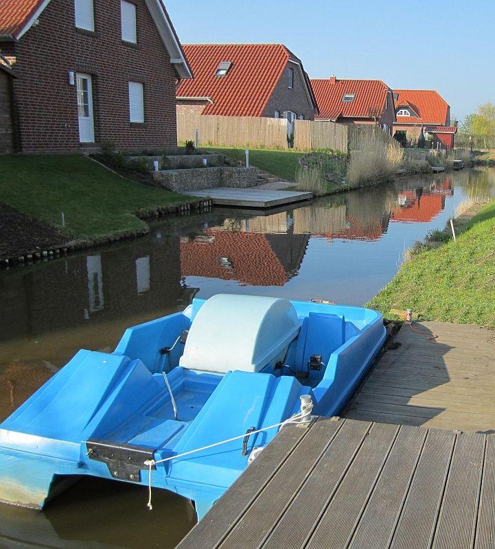 Ferienhaus am Wasser in Greetsiel mit Kamin, Garten, Wärmekabine und eigenem Bootssteg für entspannte Tage.