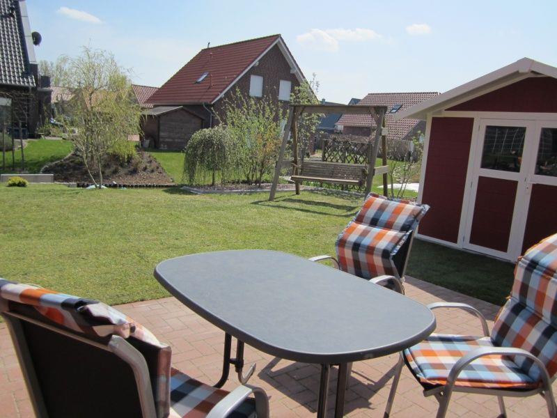 Für den erholsamen Aufenthalt im Garten stehen 6 gemütliche Stühle mit einem Tisch für Sie bereit. Auch eine Hollywoodschaukel aus Holz lädt zum Entspannen ein.