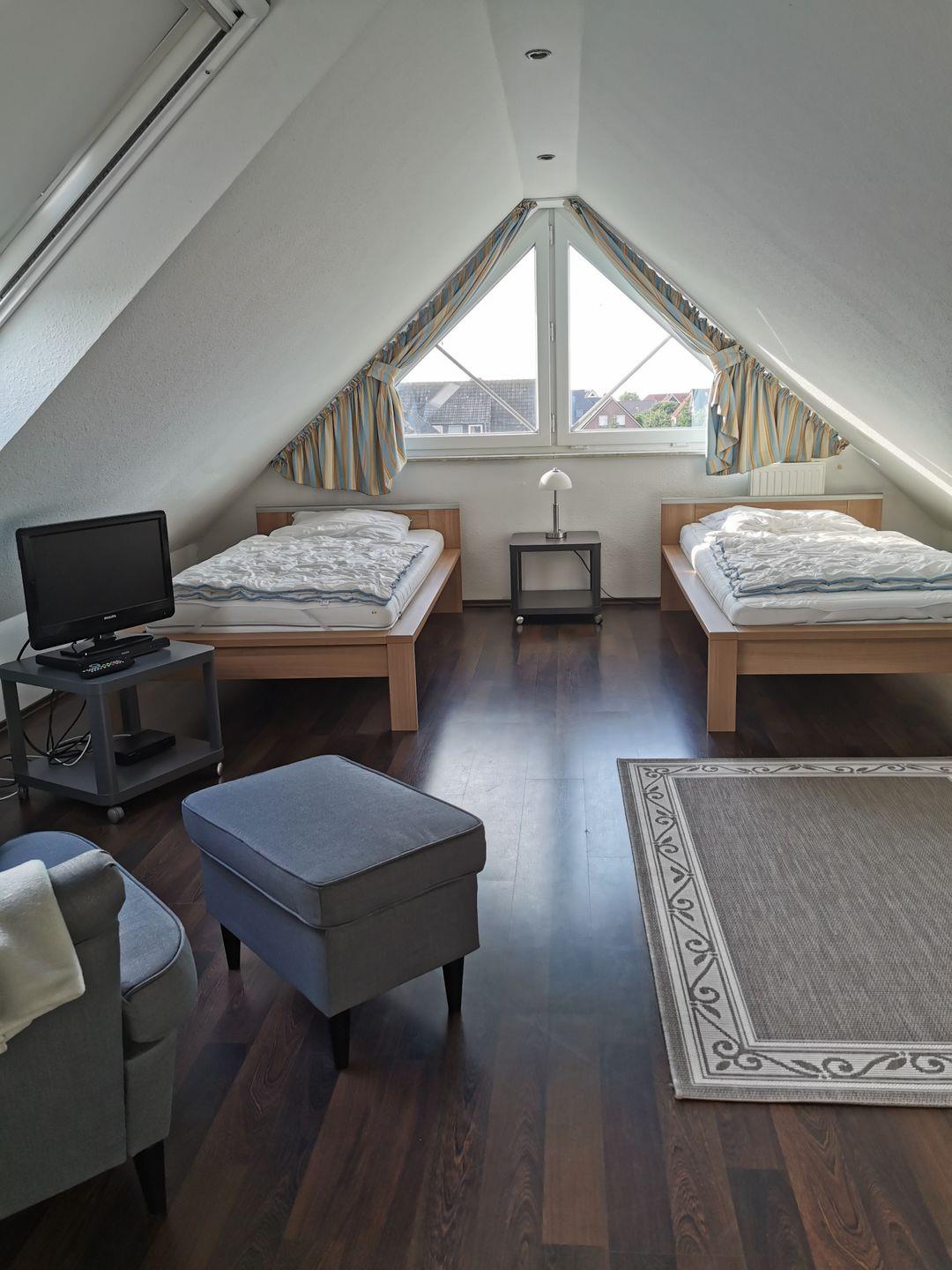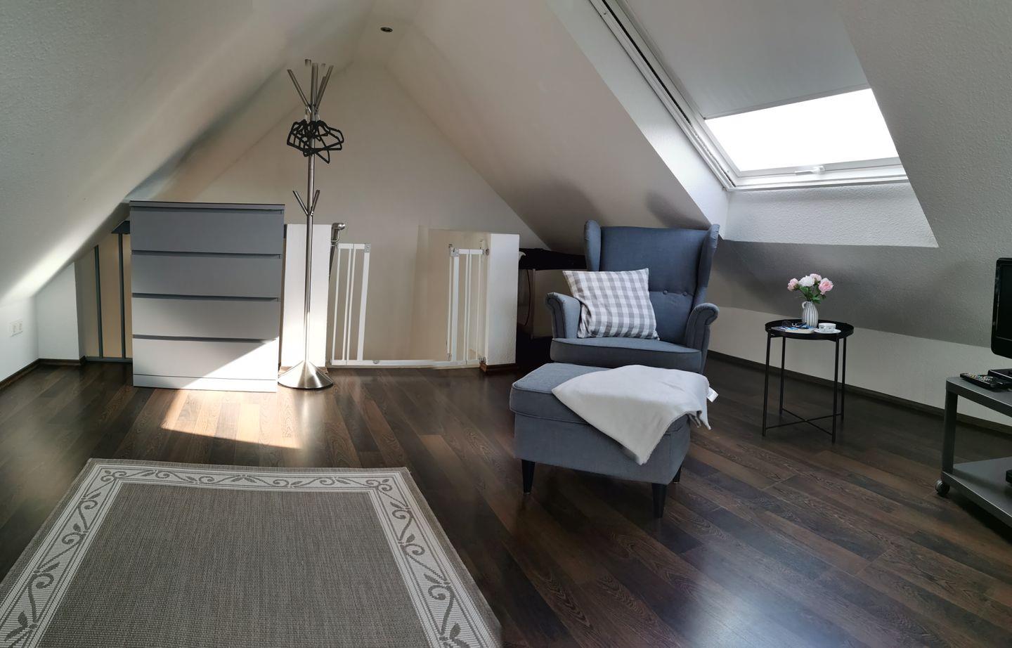 Der 2. Schlafraum befindet sich in der großen Galerie (2*Einzelbetten). Die Galerie ist mit Laminatfußboden ausgelegt. Außerdem finden Sie hier einen gemütlichen Ohrensessel und einen weiteren Fernseher.