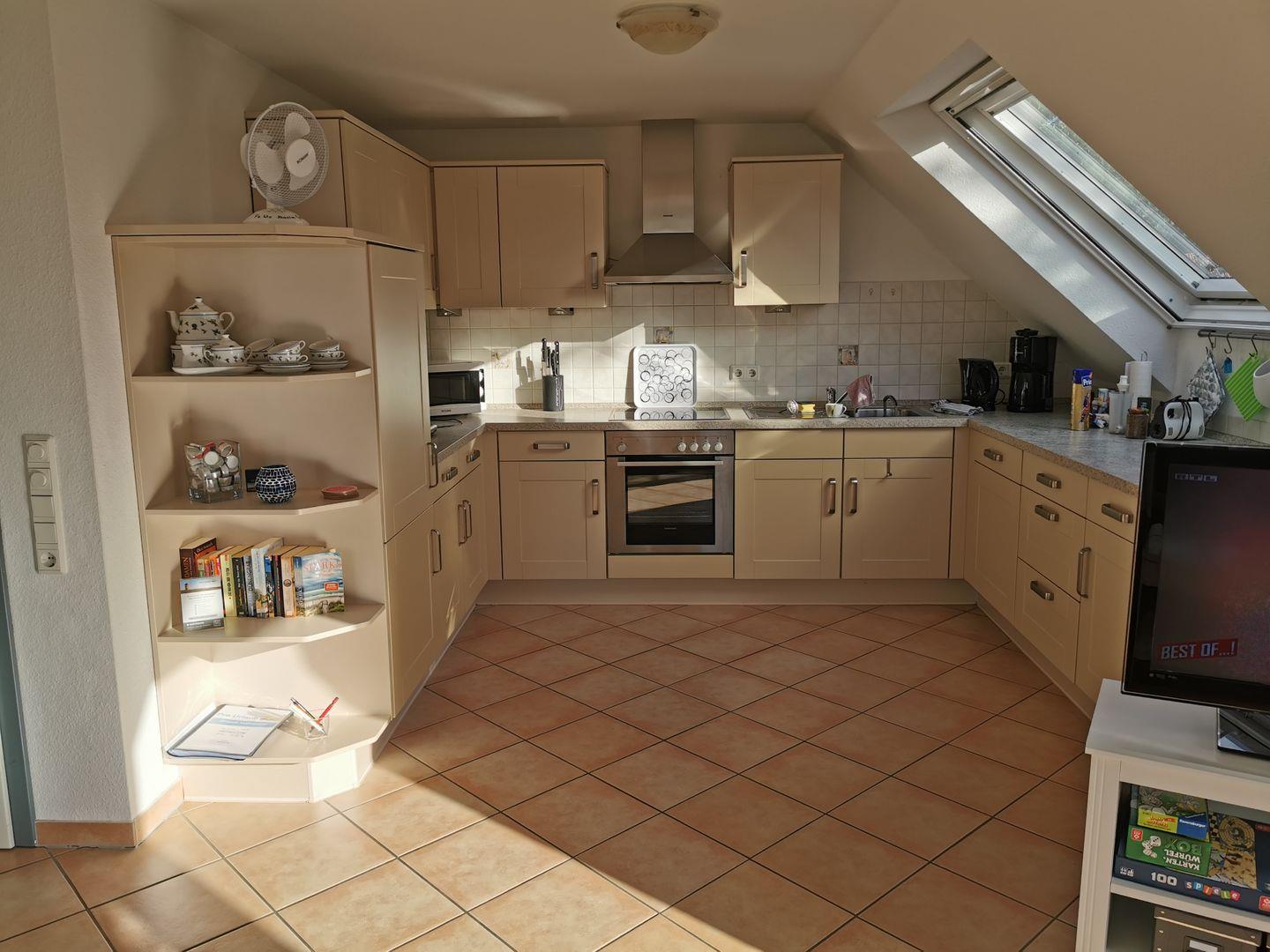 Großer geschmackvoll eingerichteter Wohn-/Essbereich mit voll ausgestatteter Küche z. B. Kühlschrank mit Gefrierfach, Mikrowelle, Backofen, Spülmaschine, Cerankochfeld, Mixer, Tassimo-Kapselmaschine, Kaffeemaschine, Toaster, Eierkocher, Wasserkocher, u.v.m. Ein Bügeleisen ist ebenfalls vorhanden.