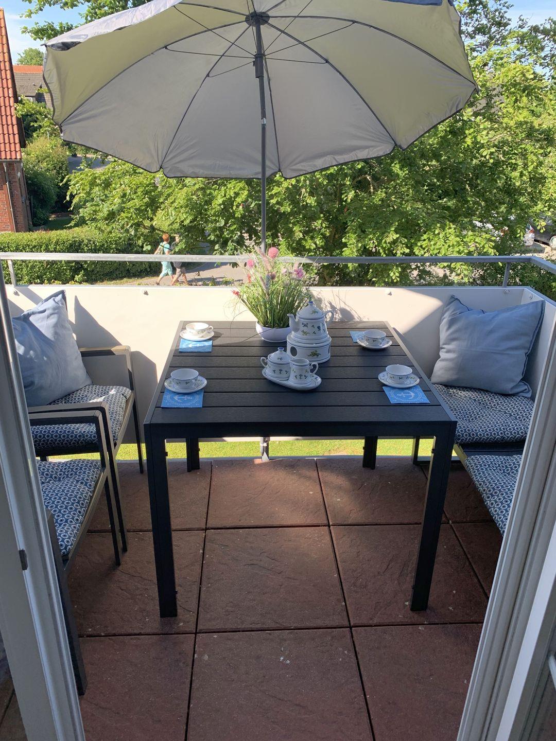 Der Balkon ist mit Mobiliar ausgestattet. Ein Sonnenschirm ist vorhanden.