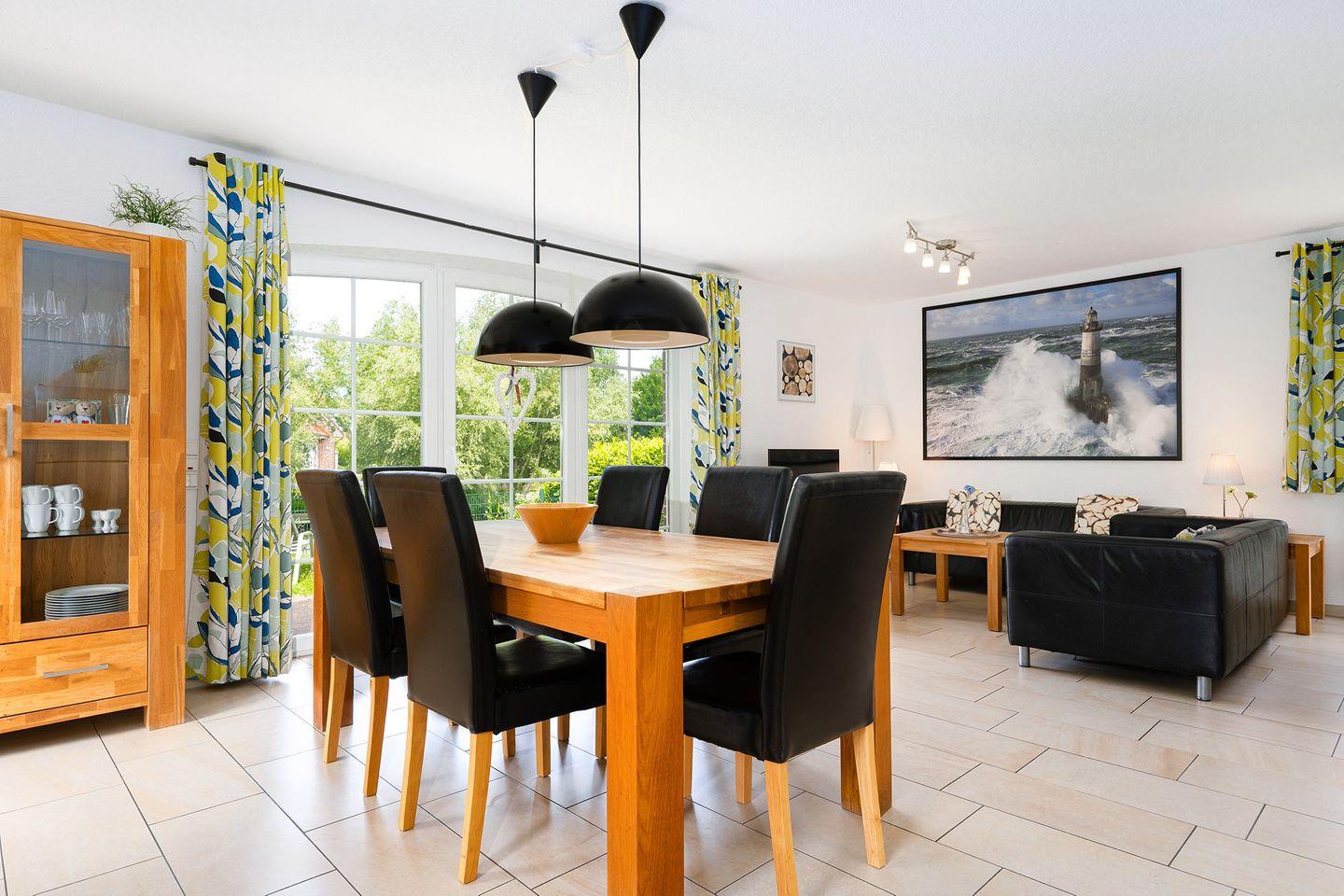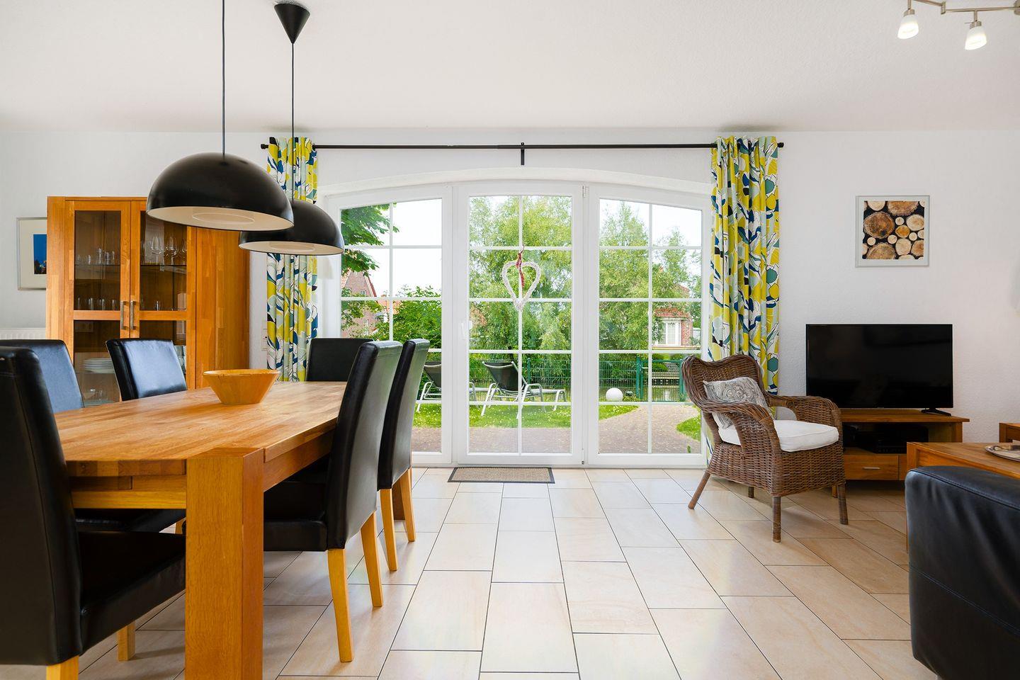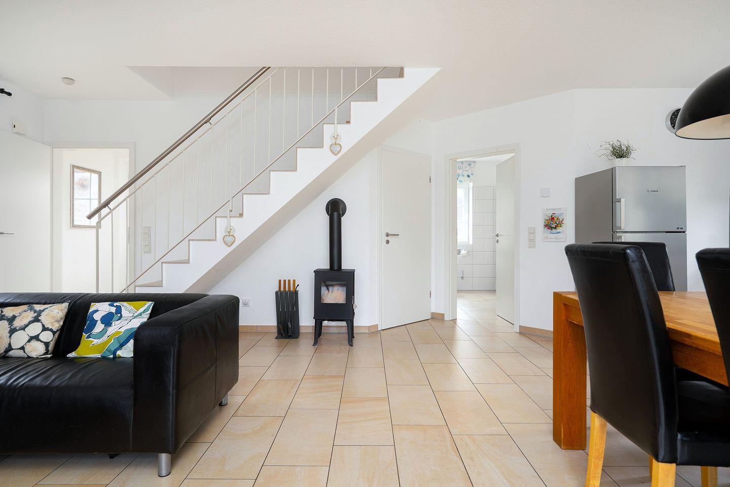 Das Haus Sielstern, fertiggestellt im Januar 2013, verfügt über einen großzügigen Wohn-Essbereich mit angenehmer Fußbodenerwämung, drei Schlafzimmern und zwei Bädern. Die gemütliche Ledercouch im unteren Wohnbereich lädt zum Verweilen vor dem Kaminofen oder dem Flachbildfernseher (inkl. WLAN Stick für Videoempfang) ein. Die komplett ausgestattete Küche (Geschirrspüler, großer Kühlschrank mit großem Gefrierfach, Mikrowelle, Kaffeemaschine, Wasserkocher, Toaster, Eierkocher u.v.m.) lässt keine Wünsche offen. Das Haus verfügt über 2 Terrassen mit Gartenstühlen und 2 Gartenliegen von wo aus Sie den herrlichen Blick aufs Wasser genießen können. Im Erdgeschoss befindet sich außerdem noch ein Schlafzimmer mit einem Doppelbett und ein großes Badezimmer mit einer 2 Personen-Sauna und eine ebenerdige Dusche, auch ein Handtuchwärmer ist vorhanden. Das komplette EG ist für Rollstuhlfahrer geeignet, auch die Zuwegung zum Haus wurde angepasst.