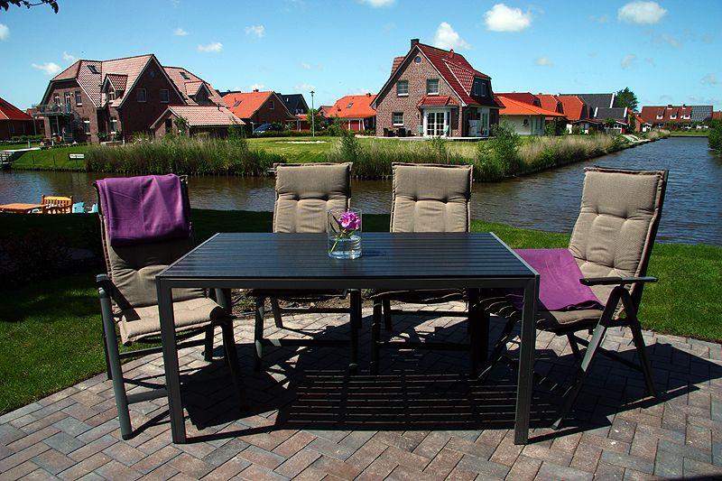 Moderne Ferienwohnung mit eigenem Bootssteg und Terrasse in Greetsiel am Wasser.