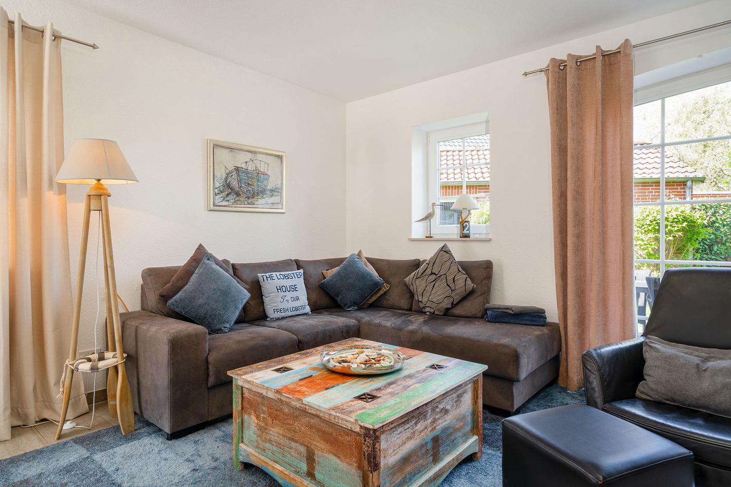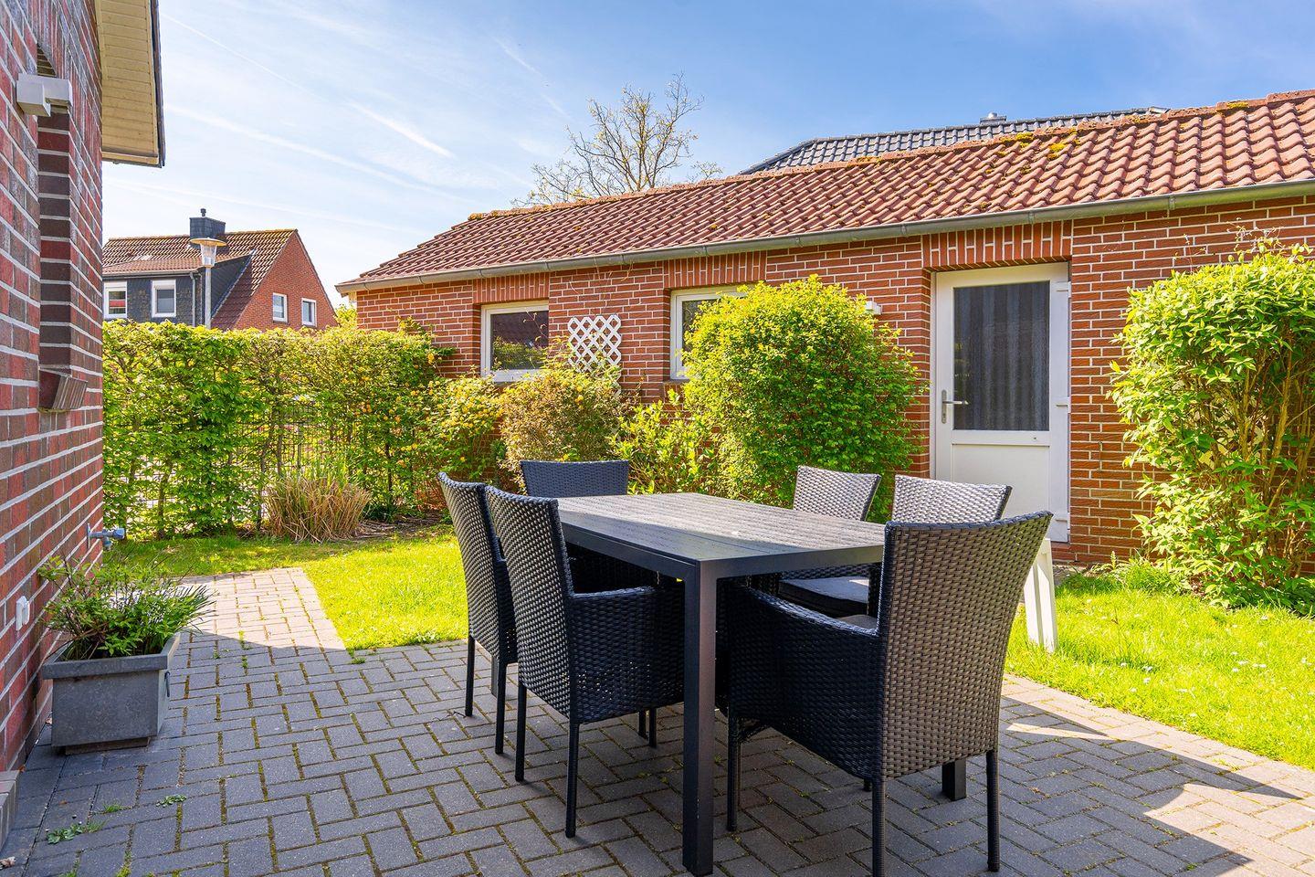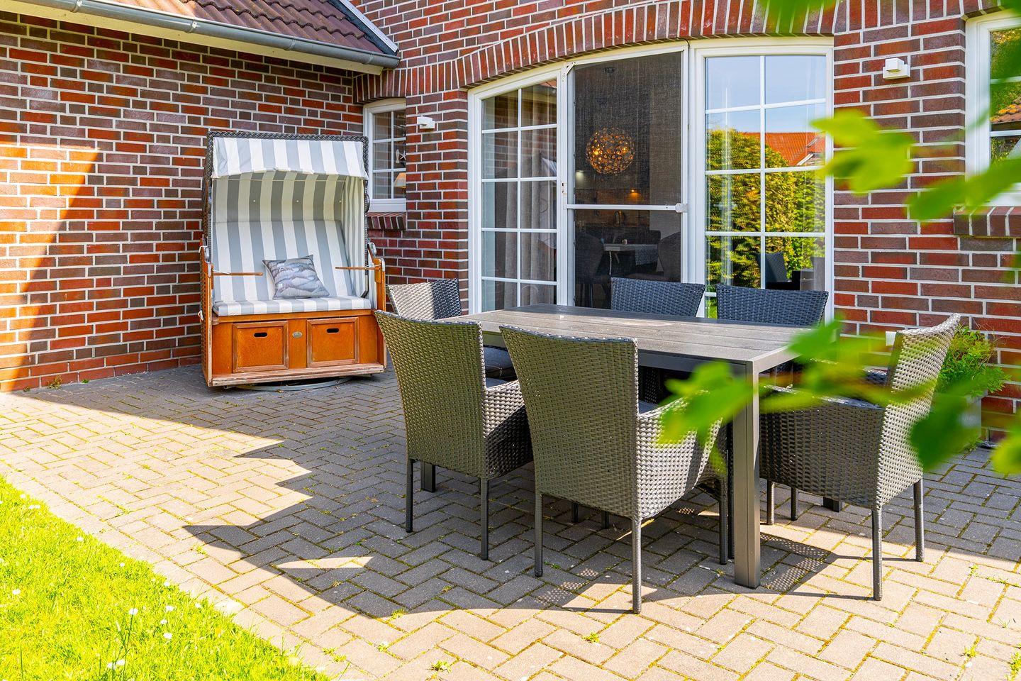 Unser Haus bietet Ihnen einen eingezäunten Garten. Die mit Flechtmöbeln, Sonnenliege und Sonnenschirm schön möblierte Sonnenterrasse lädt zum Faulenzen ein. Ein Grill steht ebenfalls für die Nutzung bereit. Bei „Schietwetter“ bietet Ihnen ein Kaminofen die entsprechende Atmosphäre für einen Teenachmittag.