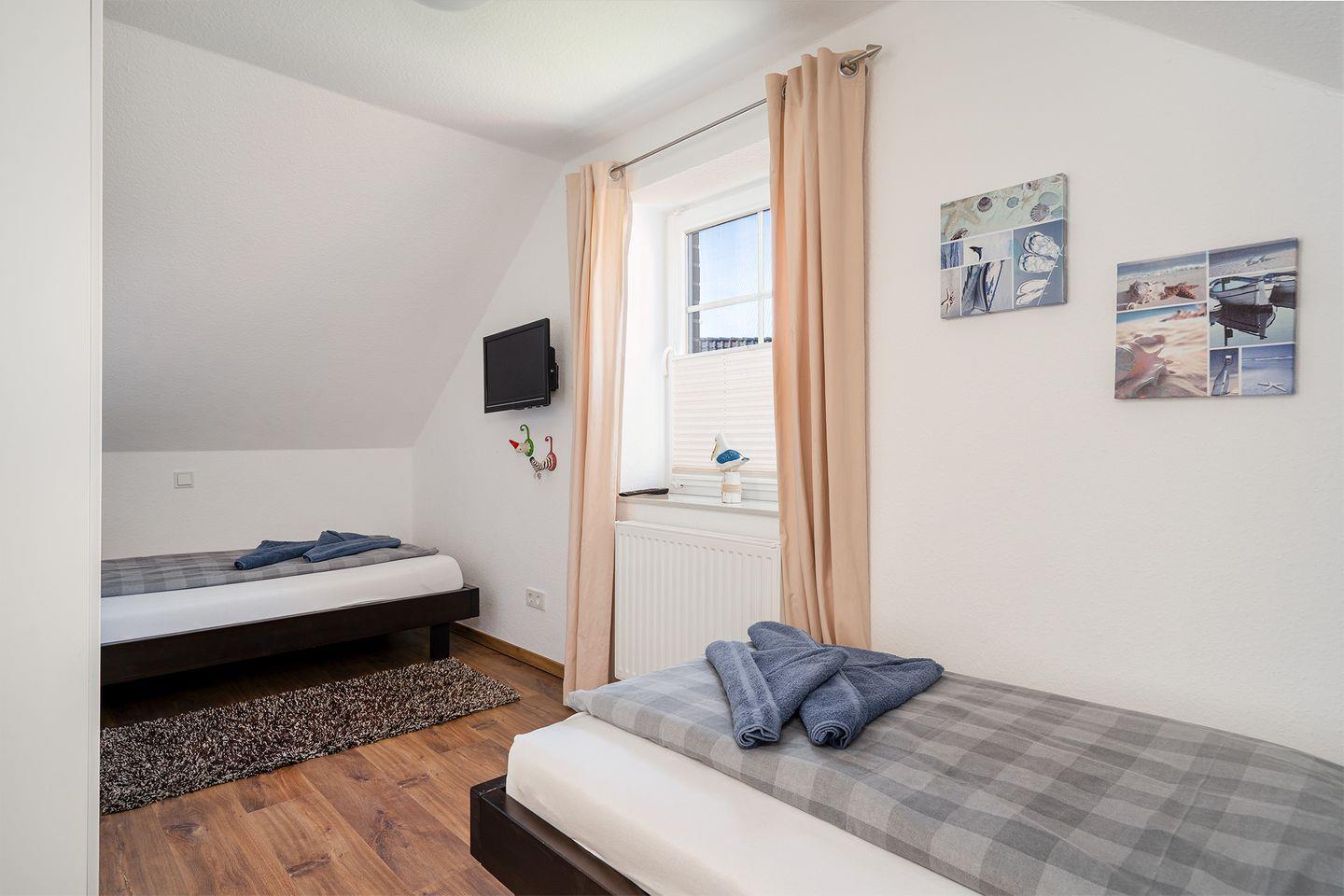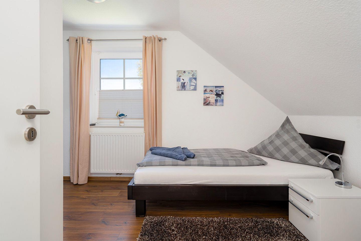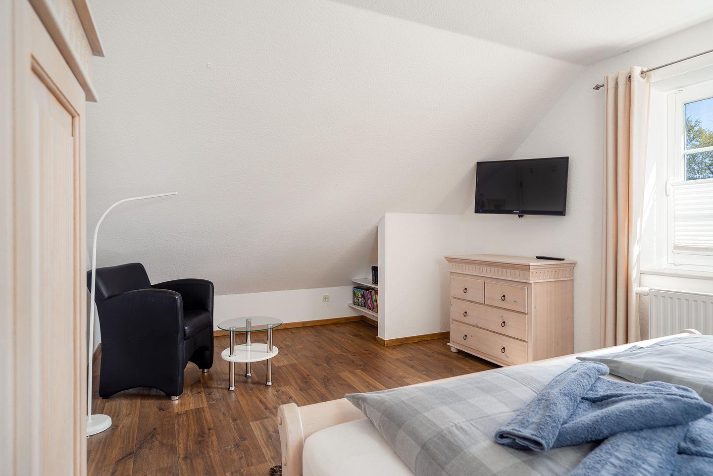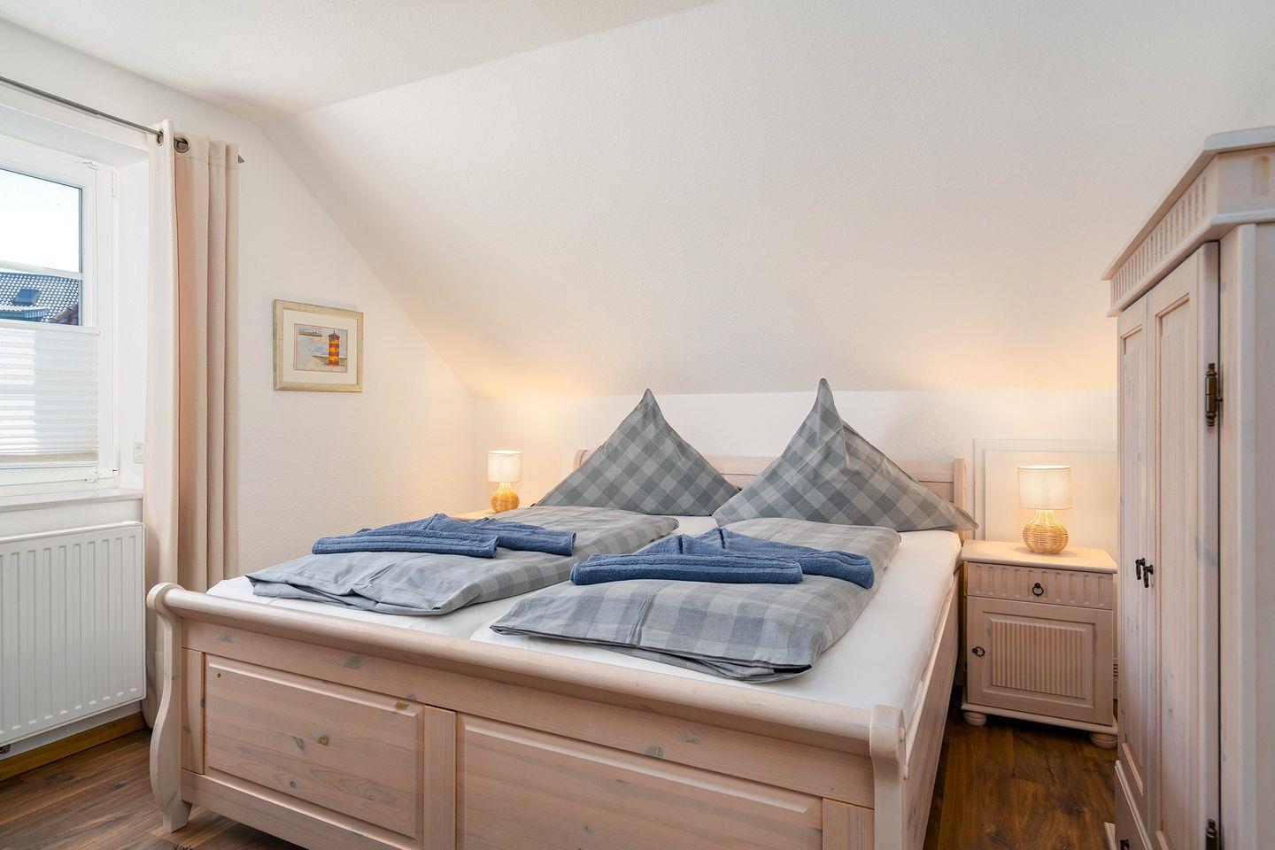 Das Wohnzimmer und alle Schlafräume verfügen über Flachbildschirme mit Satellitenempfang, DVD-Player. Das Schlafzimmer im Erdgeschoss ist vom Wohnbereich und der Küche komplett abgetrennt und verfügt wie ein weiteres Schlafzimmer im Obergeschoss über Doppelbetten (1,80 x 2,00 m). In dem dritten Schlafzimmer befinden sich zwei Einzelbetten (1 x 2,00 m). Die Fenster in den Schlafräumen und viele weitere Fenster wurden mit Fliegengittern versehen.
