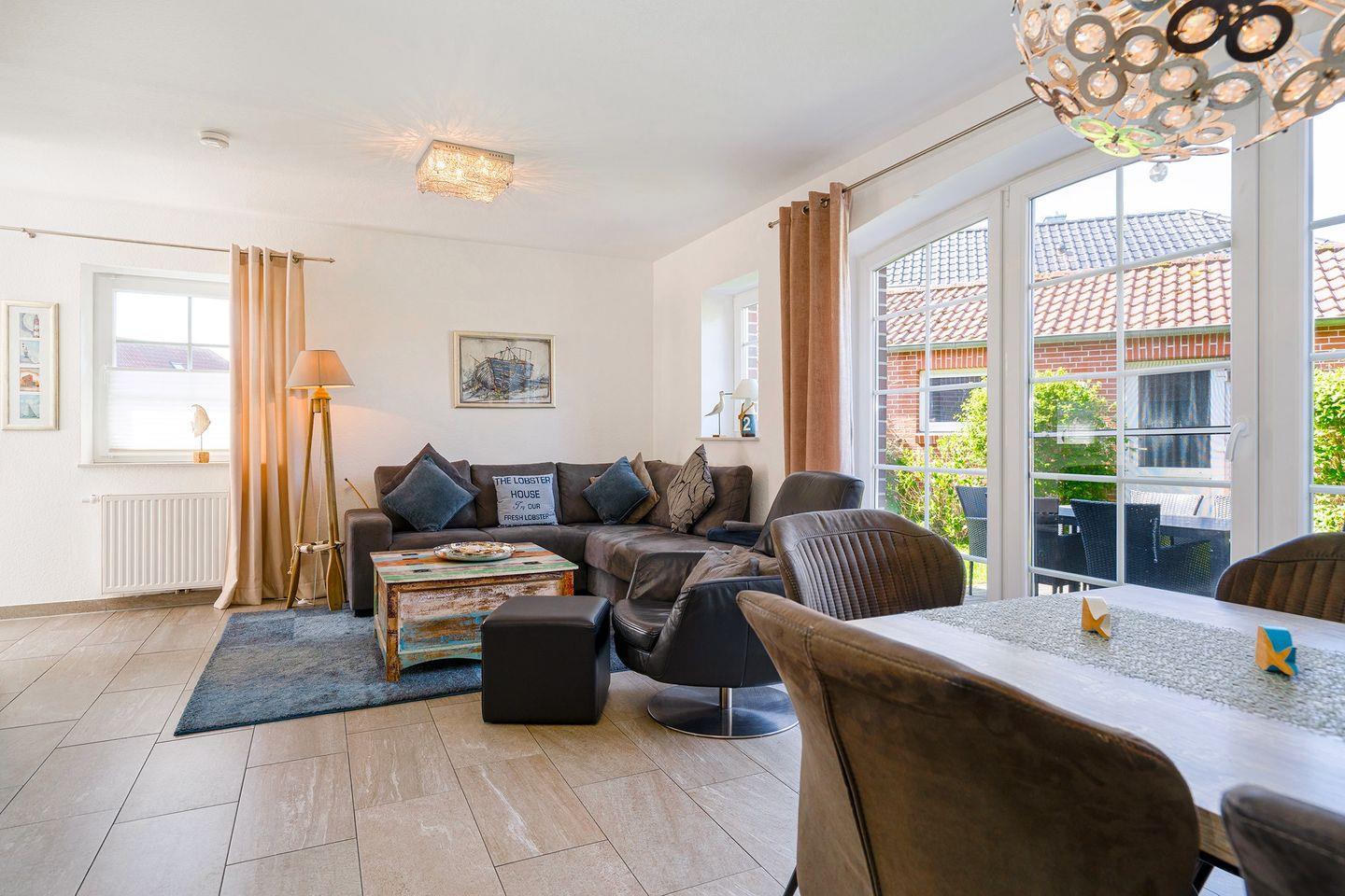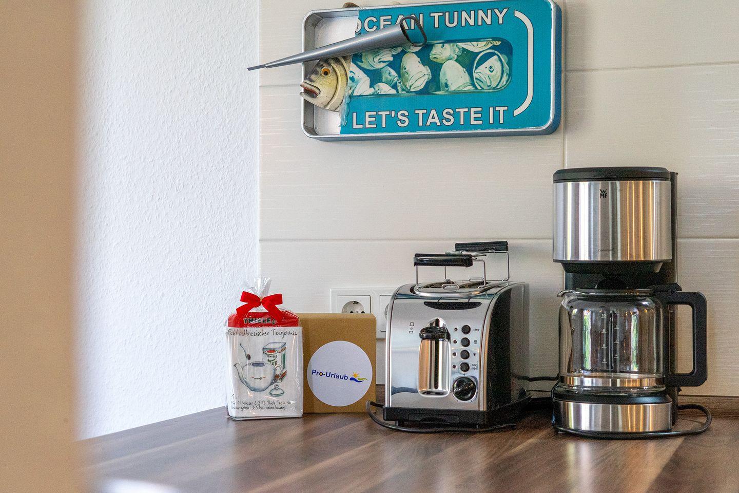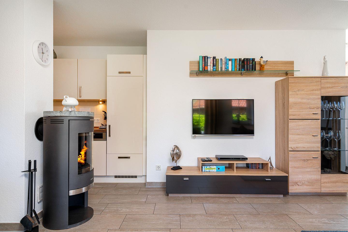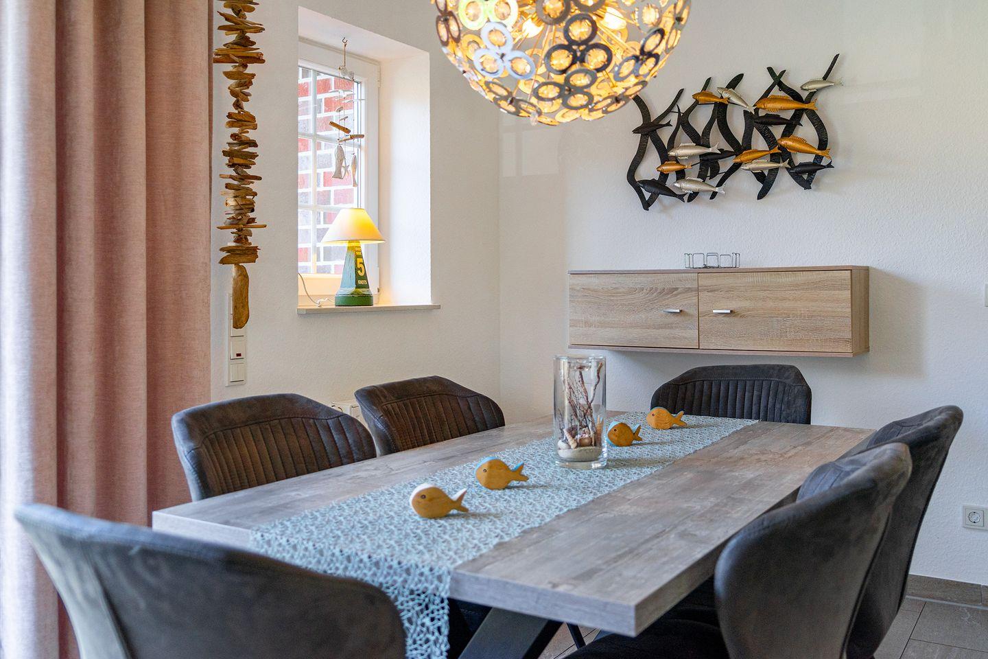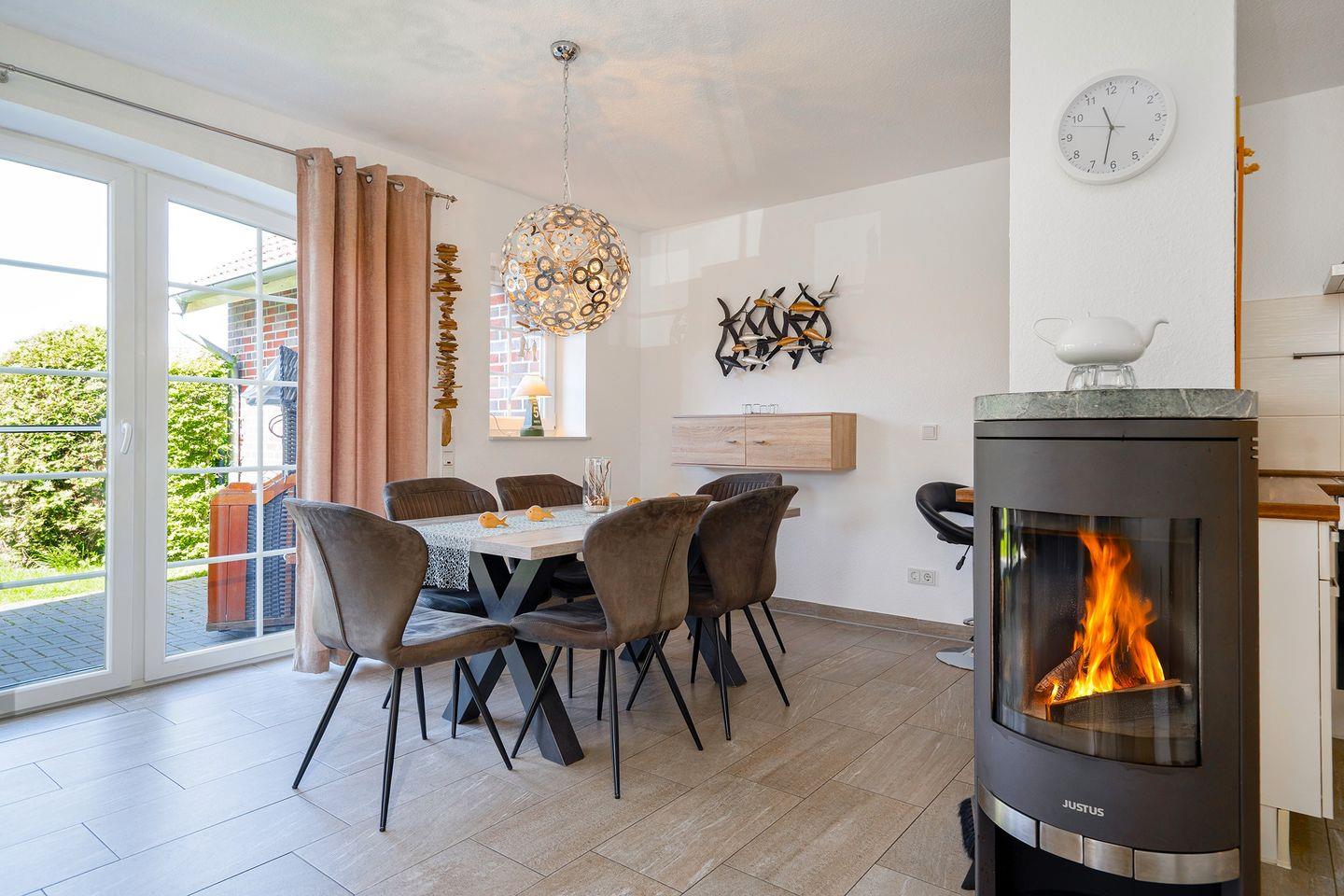 Ob in der gemütlichen Sitzecke vor dem Kaminofen oder am großen Esstisch, im „Fischhuus“ finden alle ihren Platz. Die hochwertige Küche bietet sämtlichen Luxus von Kaffeemaschine, Senseokaffeeautomat, Mikrowelle, Toaster über Eierkocher bis hin zu einem übergroßen Kühlschrank und Geschirrspülmaschine.