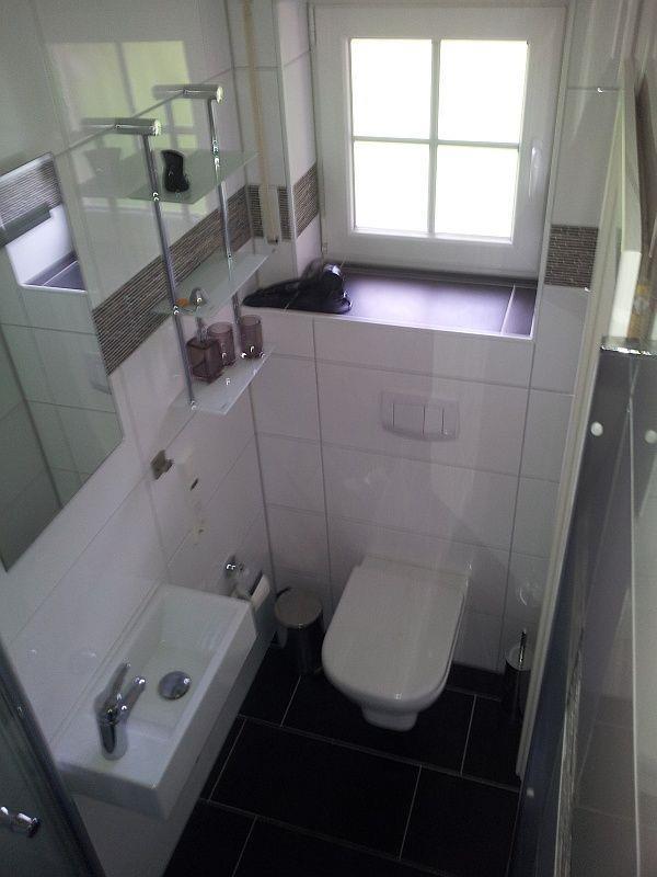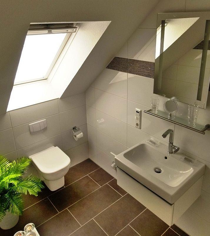 Im Erdgeschoss befindet sich ein kleines Badezimmer mit einer ebenerdigen Dusche, Waschbecken und Toilette. In der ersten Etage befindet sich ein Bad mit Duschwanne, Waschbecken, WC, Waschmaschine und Handtucherwärmung. Das Duschbad ist gefliest, die Schlafräume sind mit Laminat ausgelegt.