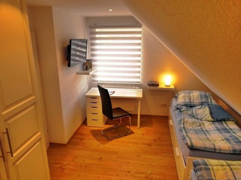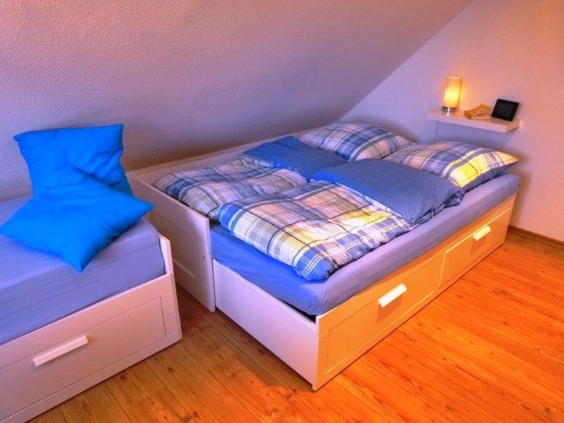 Das Ferienhaus (Nichtraucher!) verfügt über 3 Schlafzimmer (Doppelbett + 2 Einzelbetten (die jeweils zum Doppelbett ausgezogen werden können)) die sich im 1. Stock befinden. Das 3. Schlafzimmer befindet sich in der ausgebauten Galerie unterm Dach. In allen 3 Schlafzimmern gibt es einen Fernseher. Das große Veluxfenster in der Galerie ist mit einem Verdunklungsrollo ausgestattet. Auch die anderen beiden Schlafzimmer verfügen über Verdunklungsmöglichkeiten und hier ist mindestens 1 Fliegengitter pro Schlafzimmer vorhanden.