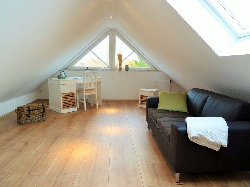 Auf der "Galerie" befindet sich eine gemütliche Ruhezone. Hier haben Sie einen Blick auf den Deich. Romane, Bücher und Gesellschaftsspiele stehen zur Verfügung.