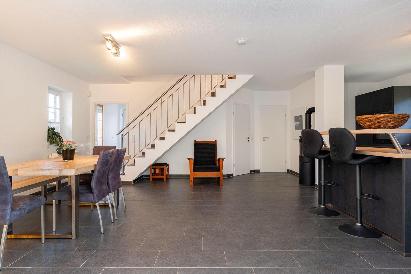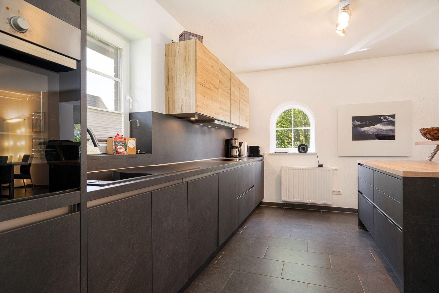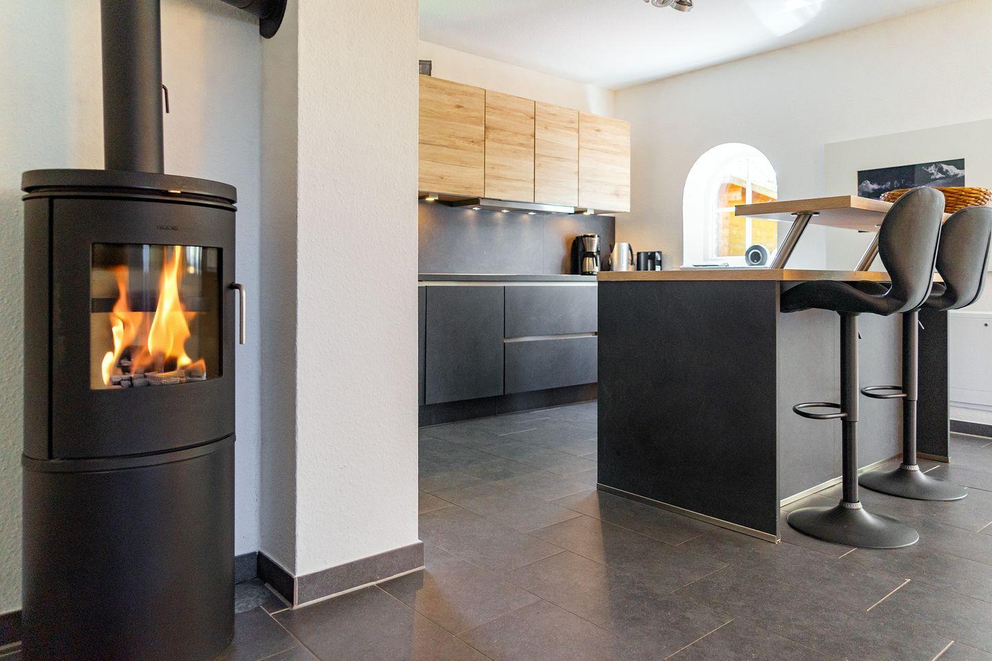 Ein Kaminofen sorgt für wohlige Wärme im offenen Wohn-Essbereich. Ein Schlafzimmer mit einem Doppelbett (2m x 1,60 m) und ein großes Badezimmer (Dusche ohne Stufe) befinden sich im EG. Die neue moderne Küche verfügt über alle Standardgeräte und ist zusätzlich zu dem Esstisch für 6 Personen mit einer Esstheke ausgestattet. Sie können also dem Koch zuschauen oder sich einfach unterhalten.