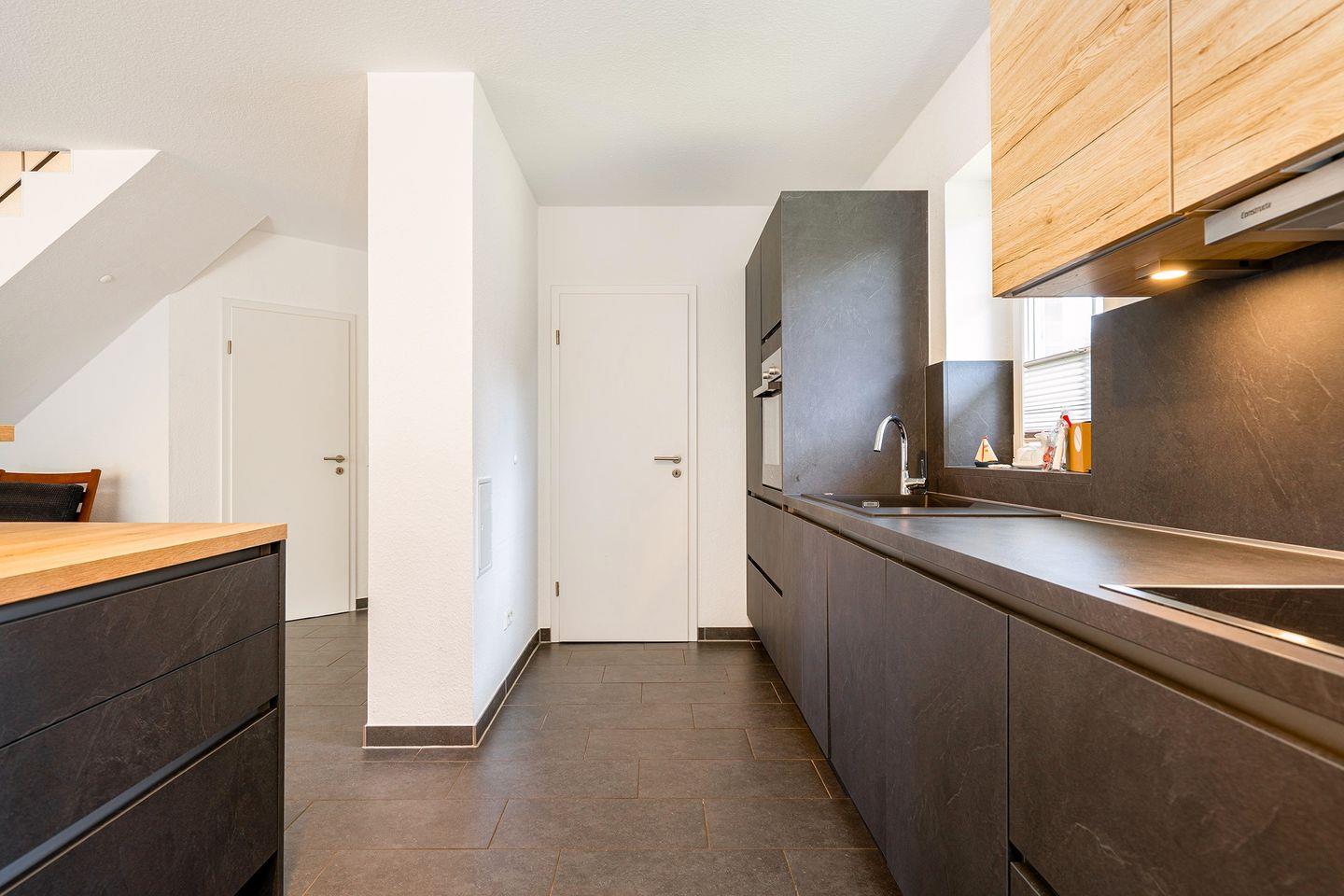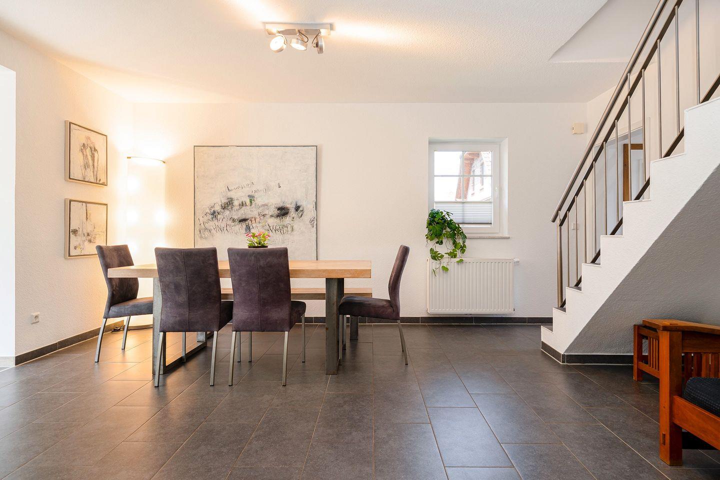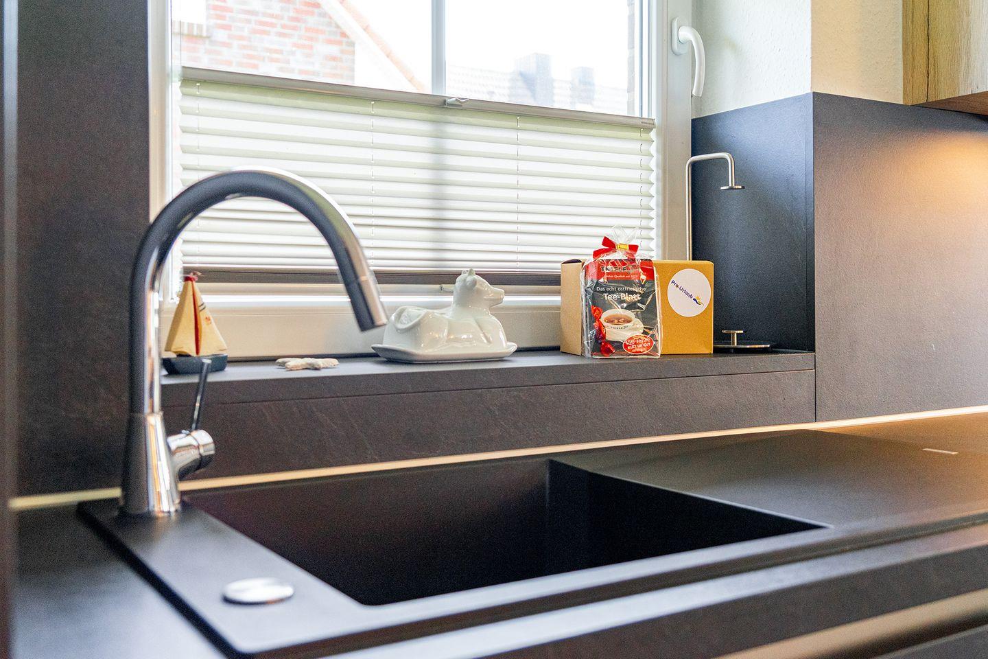 Ein Kaminofen sorgt für wohlige Wärme im offenen Wohn-Essbereich. Ein Schlafzimmer mit einem Doppelbett (2m x 1,60 m) und ein großes Badezimmer (Dusche ohne Stufe) befinden sich im EG. Die neue moderne Küche verfügt über alle Standardgeräte und ist zusätzlich zu dem Esstisch für 6 Personen mit einer Esstheke ausgestattet. Sie können also dem Koch zuschauen oder sich einfach unterhalten.