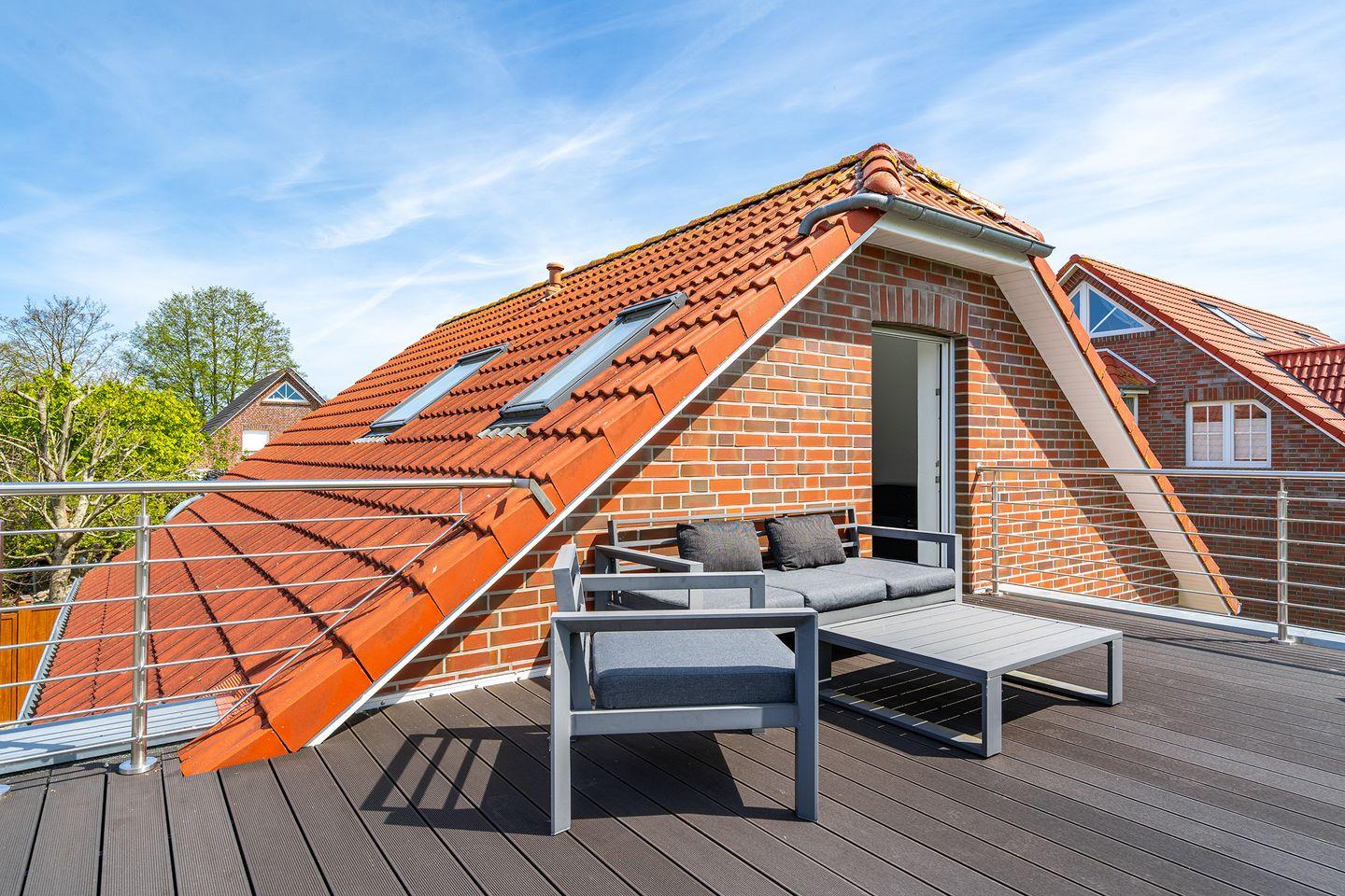 Außer der Dachterrasse gibt es auch einen kleinen Bereich neben dem Wintergarten mit Gartenmöbeln.