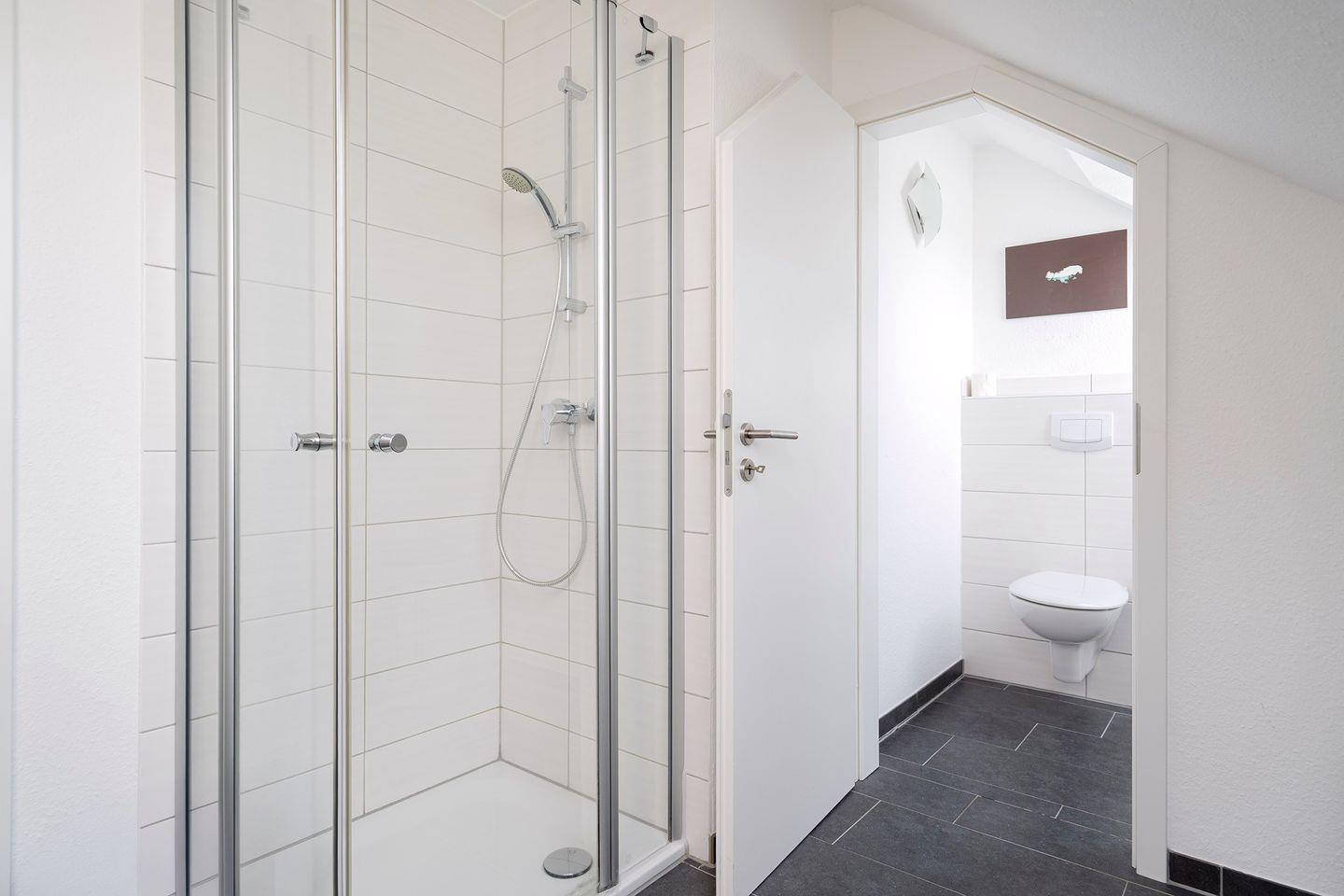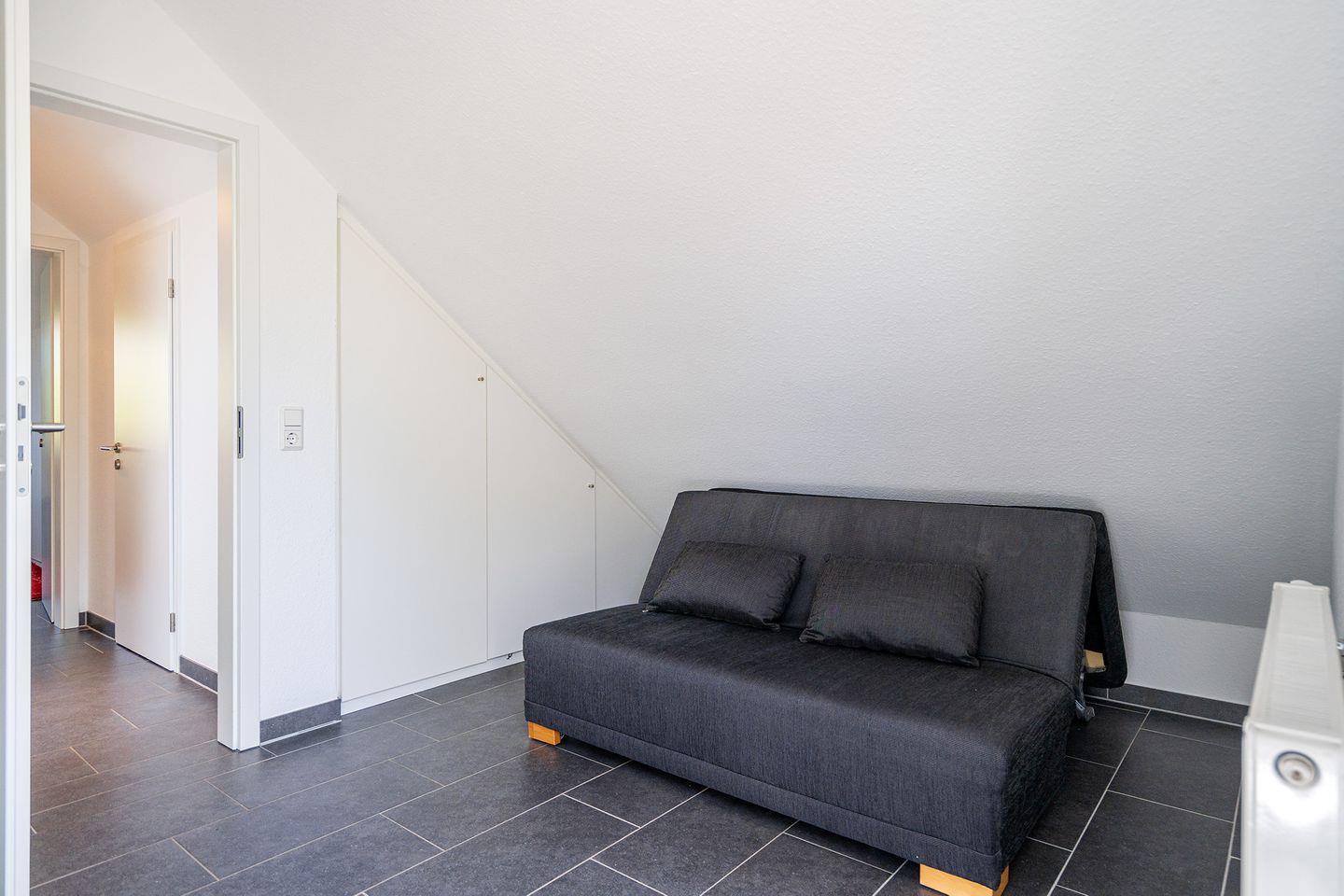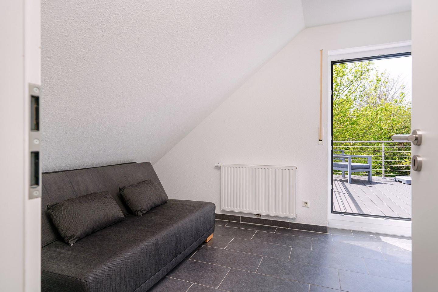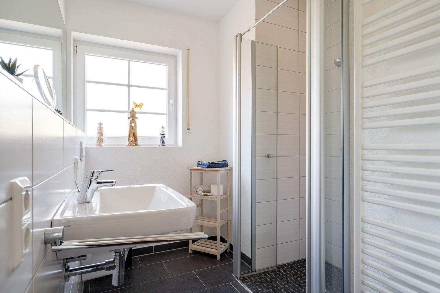 Zwei weitere Schlafzimmer (das Doppelbett hat die Größe 2m x 1,80, im dritten Schlafzimmer befindet sich eine Schlafcouch 1,55 m breit, hier sind keine weiteren Ablagemöglichkeiten vorhanden) und ein Dusch-Bad (niedriger Einstieg) mit separatem WC befinden sich im OG. Das dritte Schlafzimmer ist gleichzeitig der Durchgang für die neu entstandene Dachterrasse, auf der Sie dann abends in der Sonne gemütlich ein Glas Rotwein trinken und den Blick über Greetsiel schweifen lassen können. Das OG ist ebenfalls mit Fliesen ausgestattet. Die Schlafräume sind mit Fliegengitter ausgestattet.