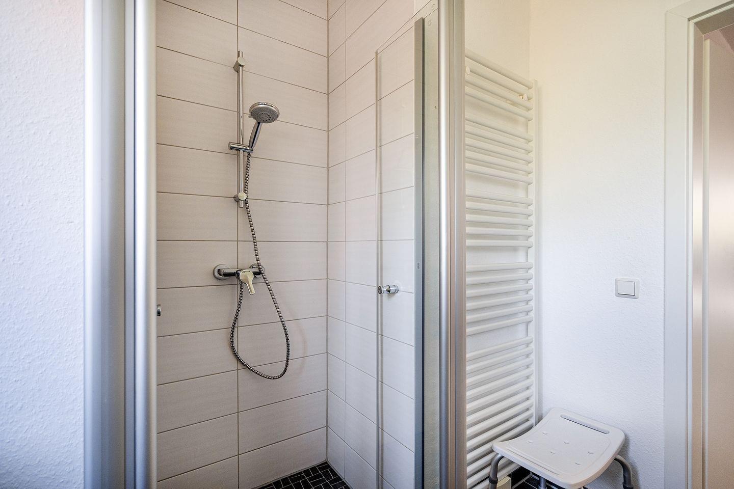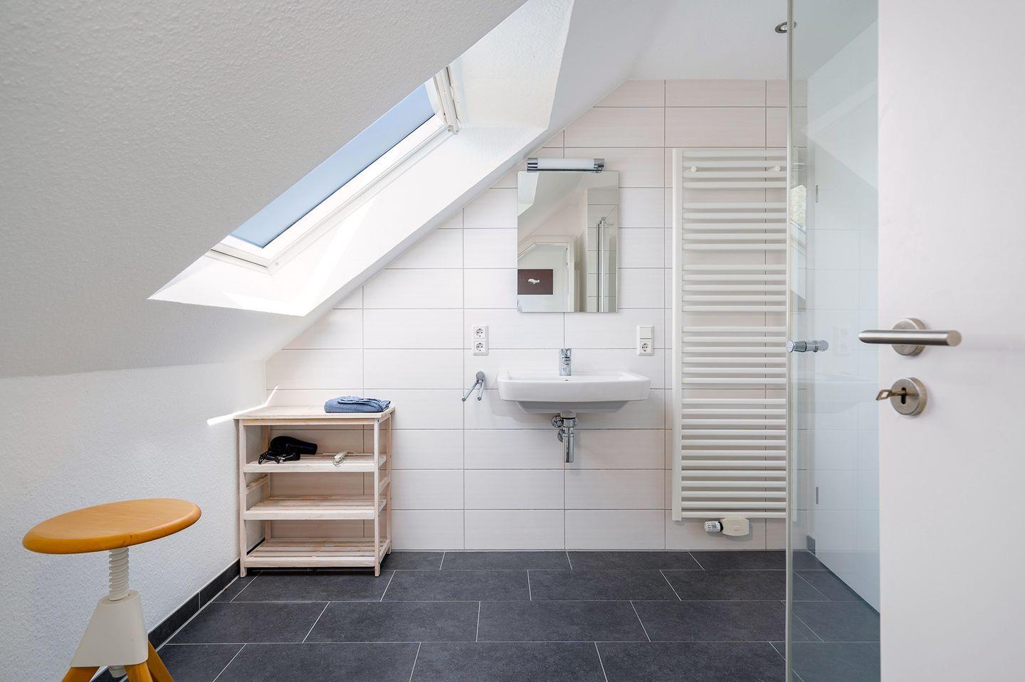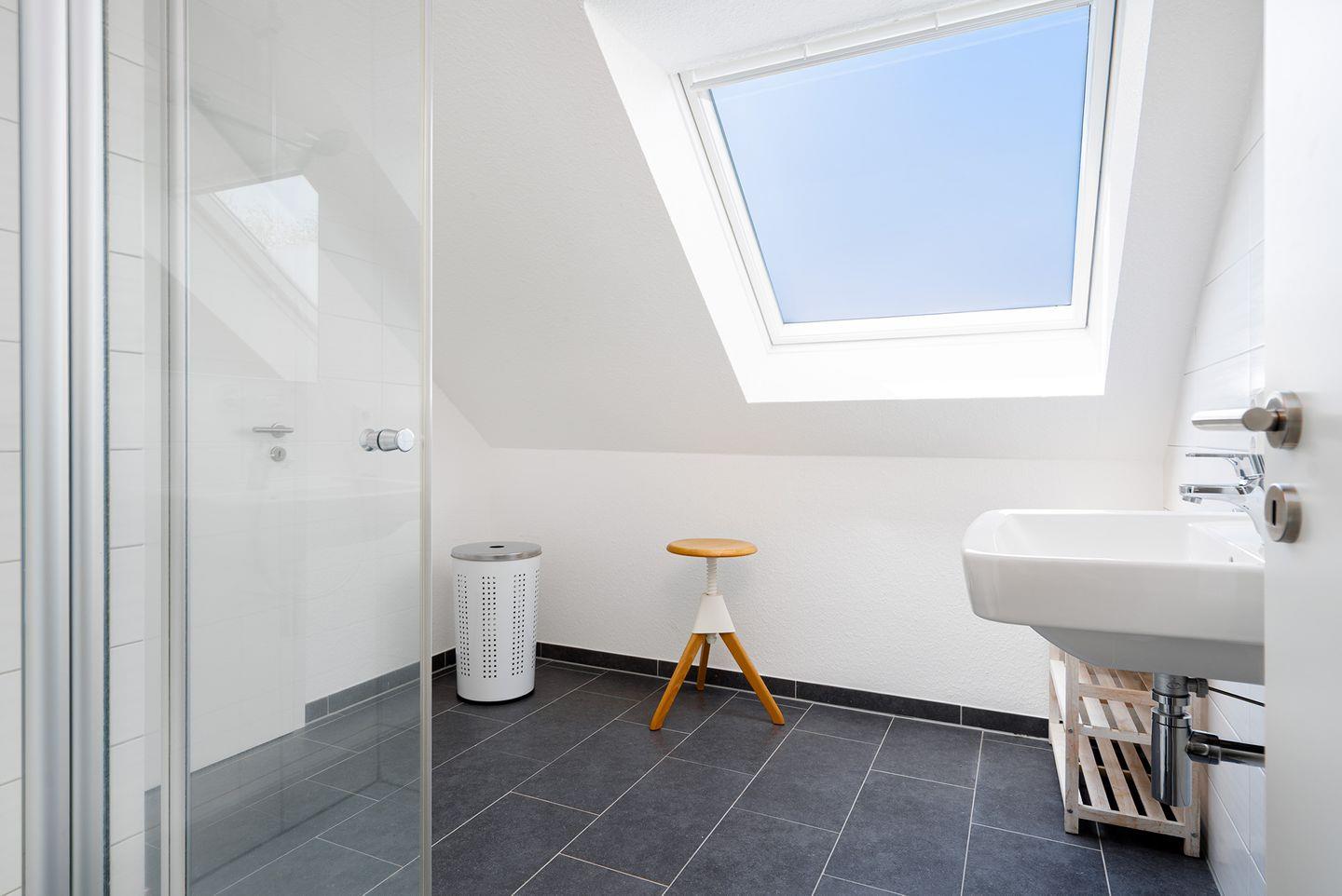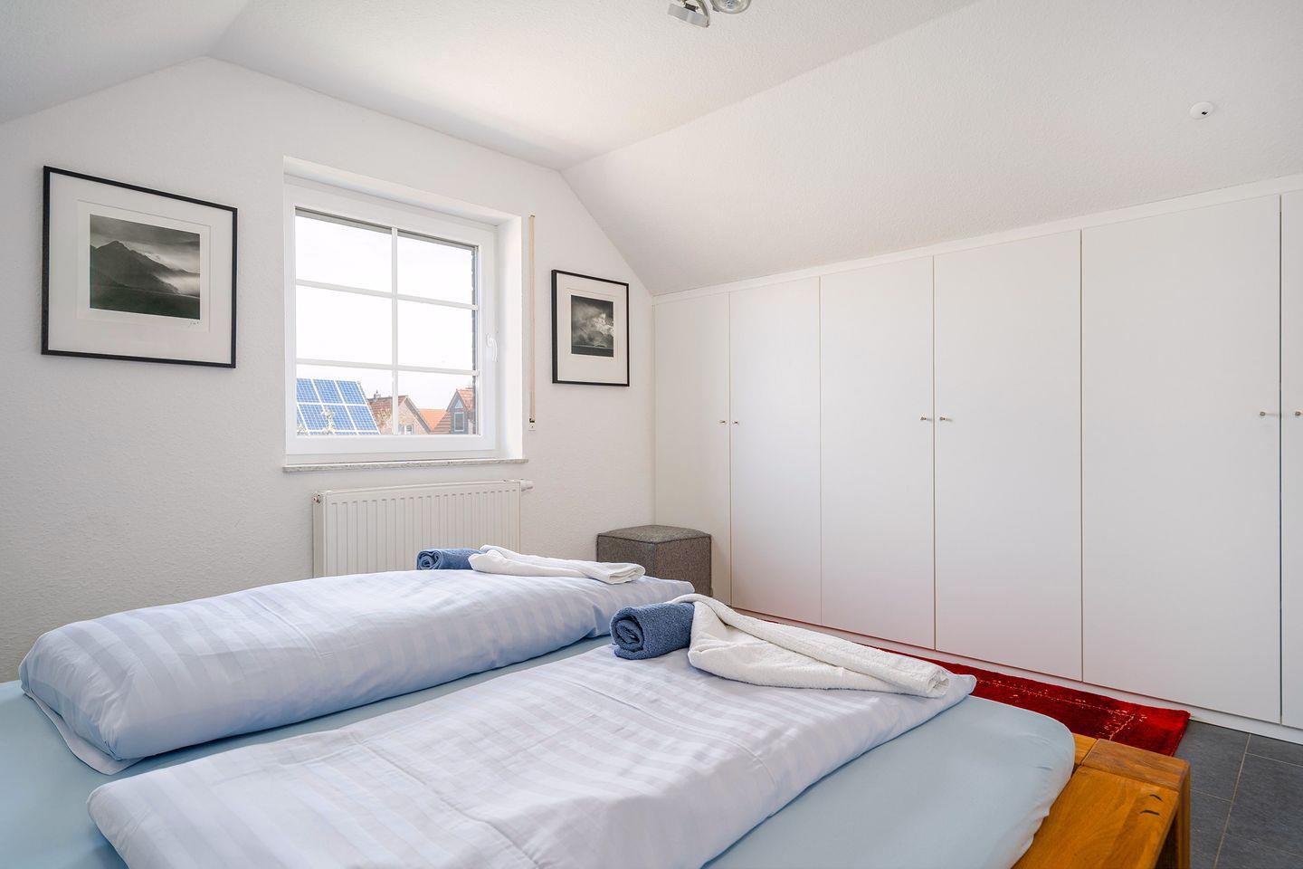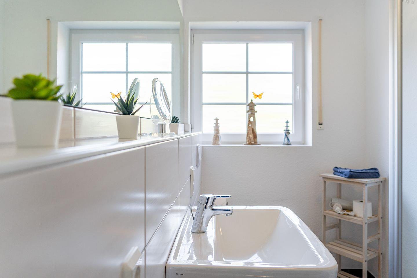 Zwei weitere Schlafzimmer (das Doppelbett hat die Größe 2m x 1,80, im dritten Schlafzimmer befindet sich eine Schlafcouch 1,55 m breit, hier sind keine weiteren Ablagemöglichkeiten vorhanden) und ein Dusch-Bad (niedriger Einstieg) mit separatem WC befinden sich im OG. Das dritte Schlafzimmer ist gleichzeitig der Durchgang für die neu entstandene Dachterrasse, auf der Sie dann abends in der Sonne gemütlich ein Glas Rotwein trinken und den Blick über Greetsiel schweifen lassen können. Das OG ist ebenfalls mit Fliesen ausgestattet. Die Schlafräume sind mit Fliegengitter ausgestattet.
