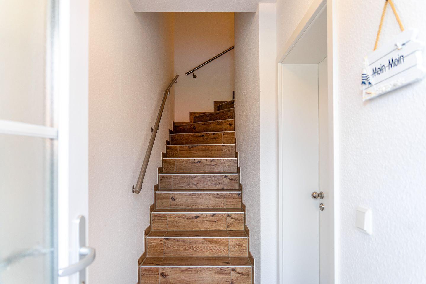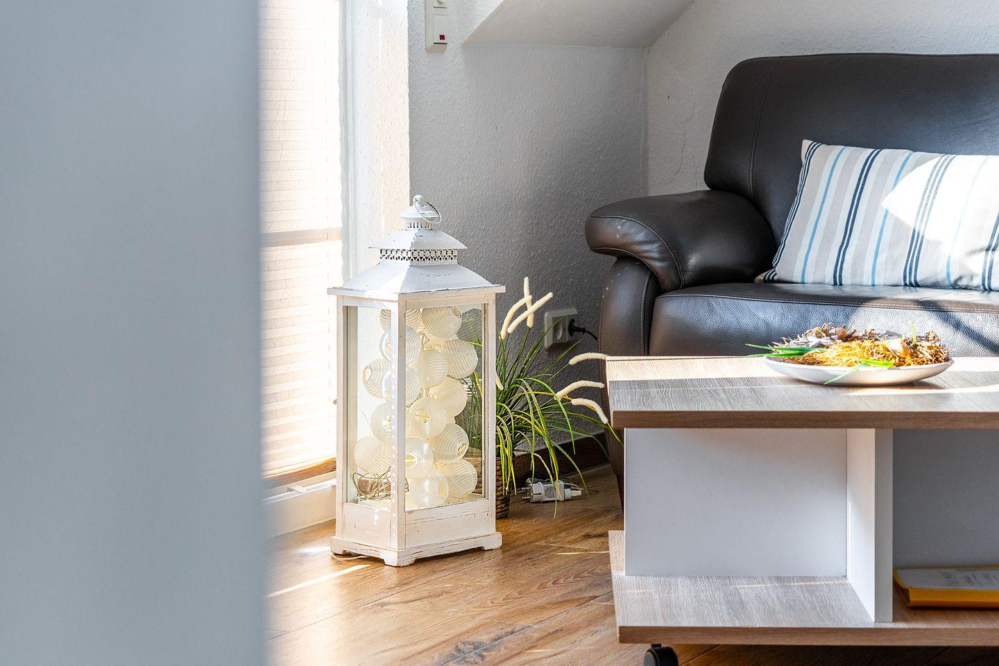 Der Fußboden ist auf Wohnebene gefliest. Im Dachstudio befindet sich schicker PVC-Boden.