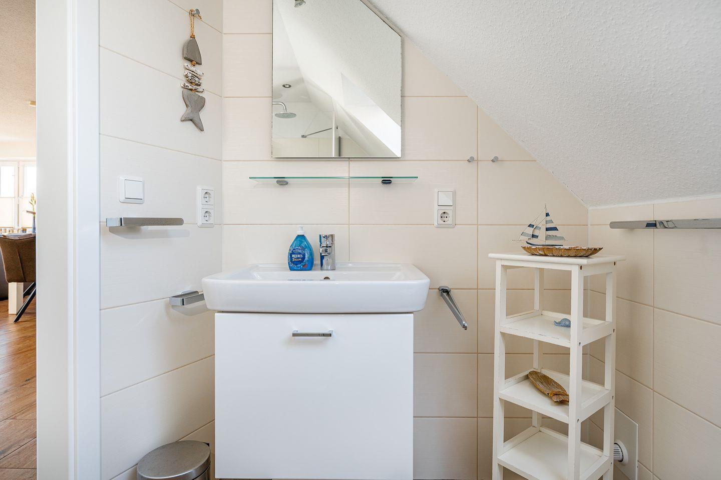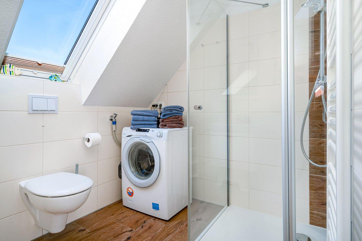Das Tageslicht-Duschbad (mit niedrigem Einstieg und Regendusche) mit WC ist mit einem Wasch-Trockner ausgestattet. Ein Handtuchheizkörper und ein Föhn sind ebenfalls vorhanden. Ein Bügeleisen und ein Bügelbrett, sowie ein Wäschetrockner befinden sich ebenfalls in der Wohnung.