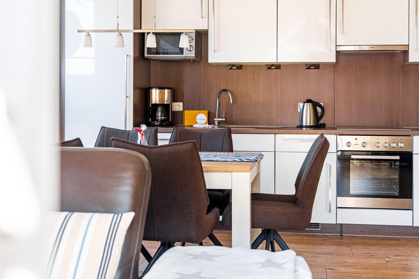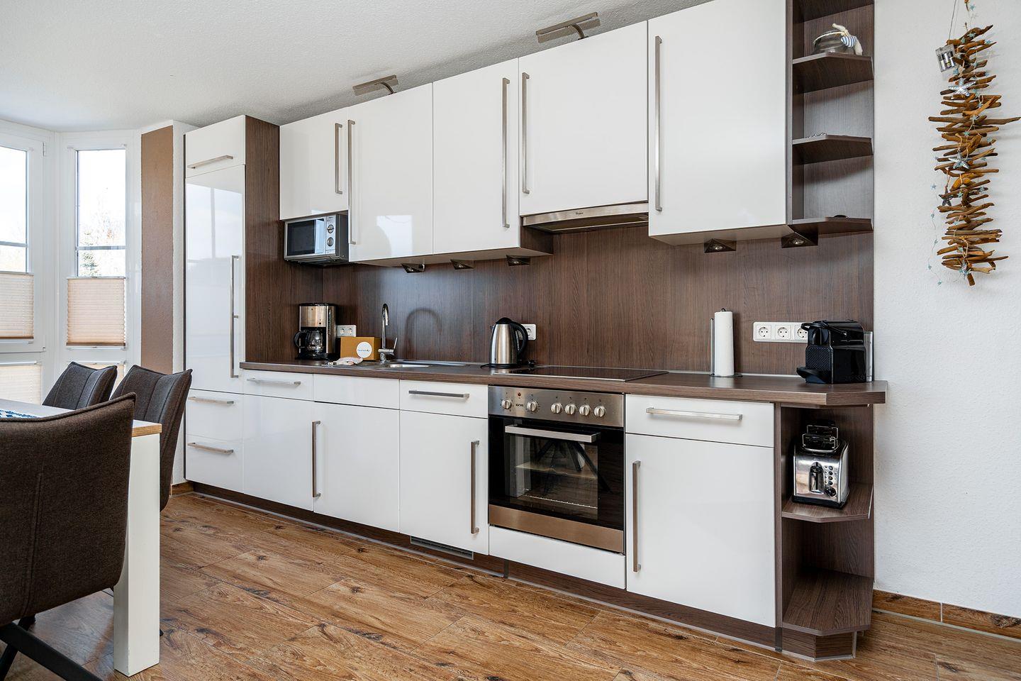 In der modernen Küche fehlt es an nichts: Ausreichend Geschirr, Töpfe, Besteck, Kaffeemaschine, Kaffeekapselmaschine (Nespresso), Mixer, Wasserkocher, Toaster, Spülmaschine, Mikrowelle, Backofen, Kühlschrank mit Gefrierfach.