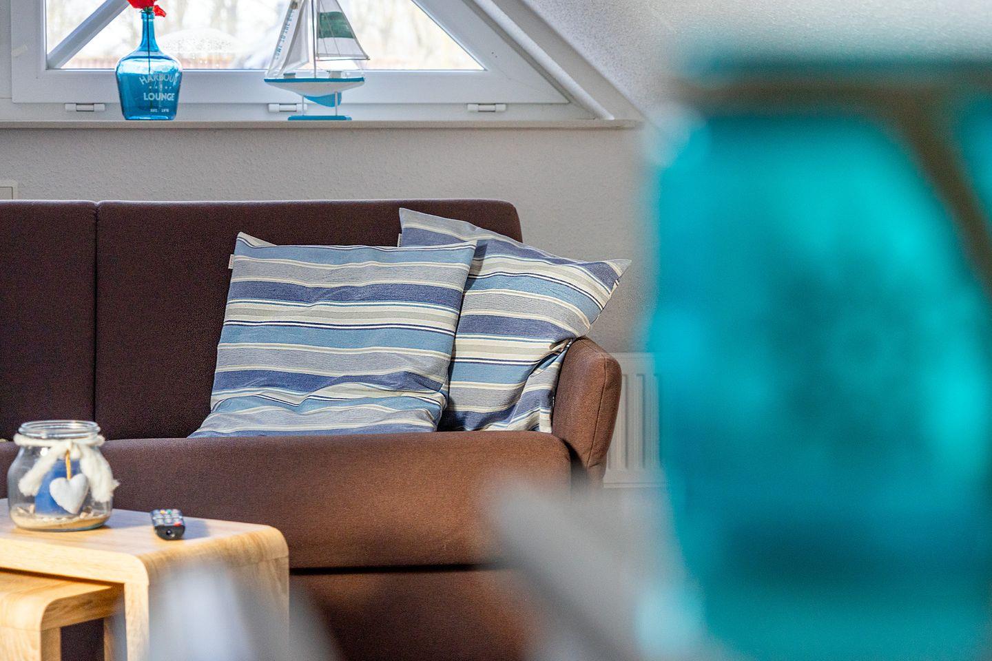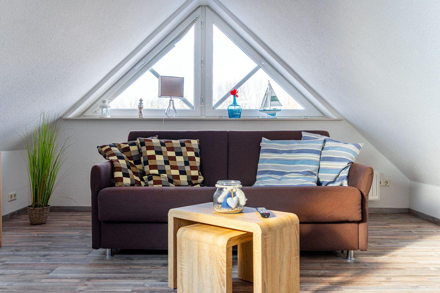 Im offenen, ausgebautem Dachstudio befindet sich eine gemütliche Ruhezone. Der Raum lädt zum Verweilen ein. Auch hier befindet sich ein weiterer Fernseher. Die (Schlaf-)Couch kann als weitere Schlafmöglichkeit (Liegefläche 2 m x 1,40 m) genutzt werden.