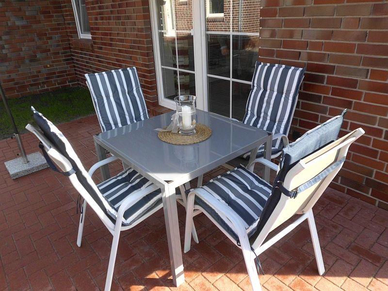 Der eingezäunte Garten mit Liegewiese und abschließbarem Gartentor verfügt über 2 Terrassen. Eine Terrasse mit Tisch und 4 Stühlen vor dem Wohnbereich, eine weitere Terrasse mit Tisch , 4 Stühlen und Sonnenschirm befindet sich im Garten im Schutz der Gartenhäuser und lädt zum gemütlichen Essen und Grillen ein. Zusätzlich stehen 2 Sonnenliegen zur Verfügung.
