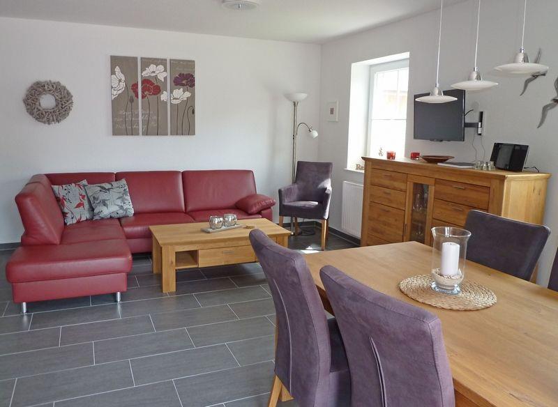 Der großzügige Wohn-/Essbereich ist ausgestattet mit Massivholzmöbeln, einem großen Ledersofa zum Relaxen, Satellitenfernseher in UHD (schwenkbar) und einer Kompakt-Stereoanlage mit Radio, CD, USB, usw.