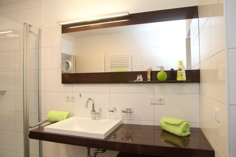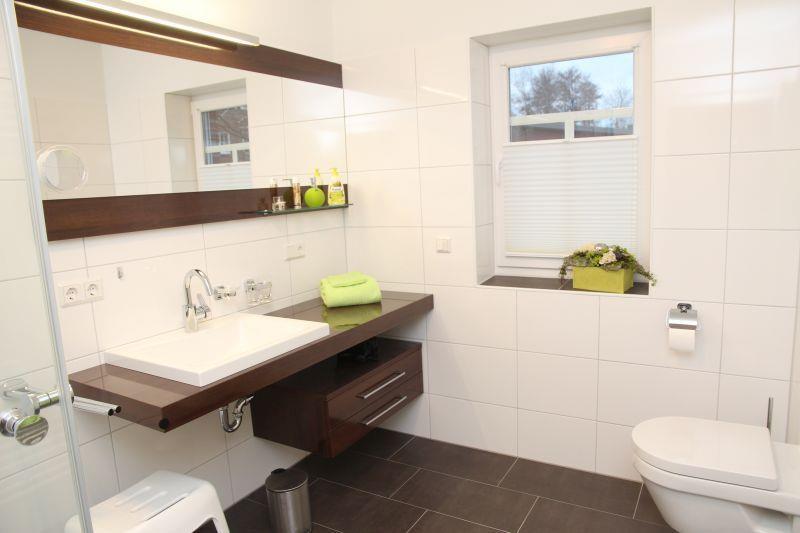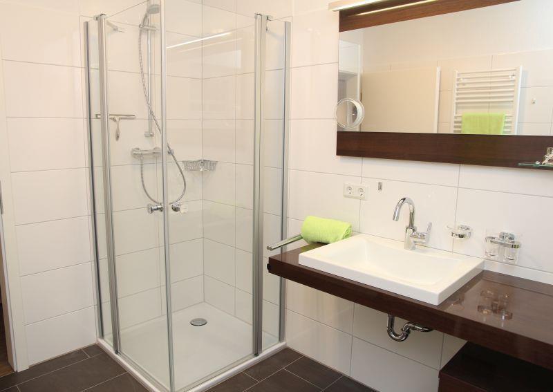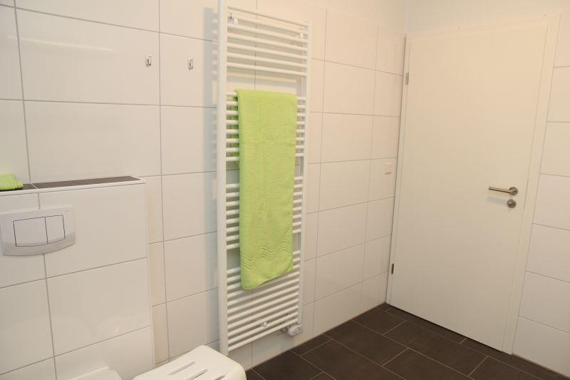 Das Badezimmer ist mit Dusche (niedriger Einstieg)/WC, Föhn und einem Handtuchheizkörper ausgestattet. Ein Duschhocker ist ebenfalls vorhanden.