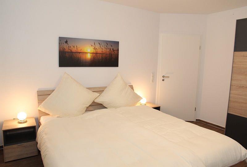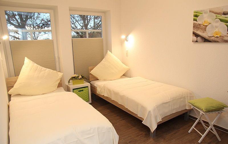 Ein Schlafraum ist mit einem Doppelbett (180 x 200 cm), der andere Schlafraum mit 2 Einzelbetten (90 x 200 cm) und jeweils mit einem weiteren TV ausgestattet. Hier gibt es Verdunklungsplissees, sowie Außenrollos.