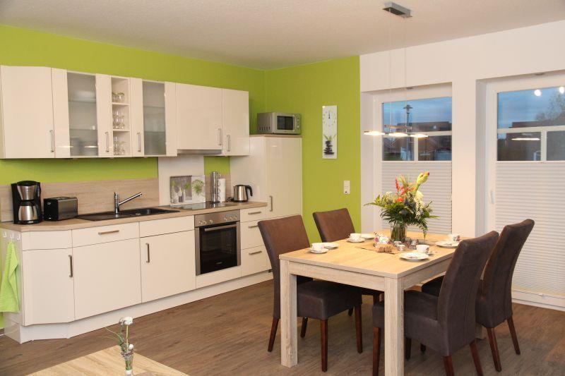 Der gemütliche Wohn-/Essbereich verfügt über eine hochwertige Einbauküche mit Cerankochfeld, Dunstabzugshaube, Backofen, Mikrowelle, Kühlschrank mit separatem Gefrierfach, Geschirrspüler, Kaffeemaschine, Toaster, Wasserkocher, Mixer, Eierkocher u.v.m.