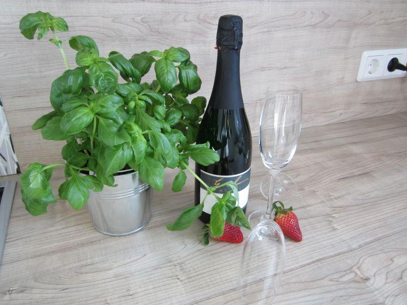 Auf dem Balkon stehen Ihnen 4 Stühle, ein Sonnenschirm und ein Tisch zur Verfügung. Zwei dieser Stühle können zu einer Sonnenliege umfunktioniert werden.