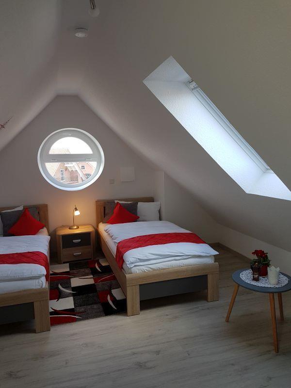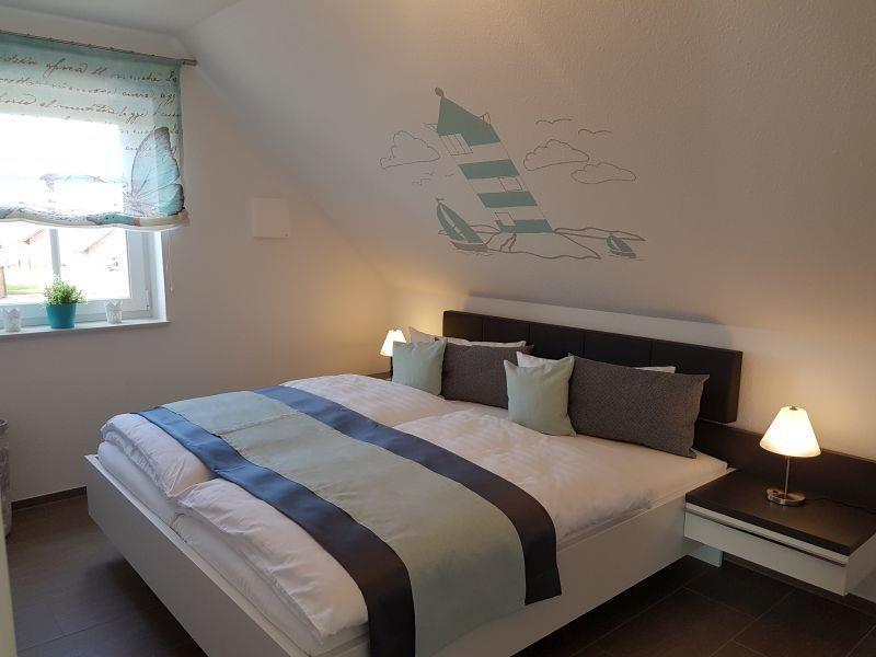 Die Wohnung ist für eine Unterbringung von bis zu 4 Personen geeignet. Dafür stehen Ihnen 2 Schlafzimmer mit jeweils 2 Betten zur Verfügung. Ein Schlafzimmer mit Doppelbett und ein Schlafzimmer mit 2 Einzelbetten im Dachgeschoss. In beiden Schlafzimmern ist jeweils ein SAT-HD-TV für Sie montiert. Die Schlafzimmerfenster sind mit Verdunklungsrollos und Fliegengitter ausgestattet.