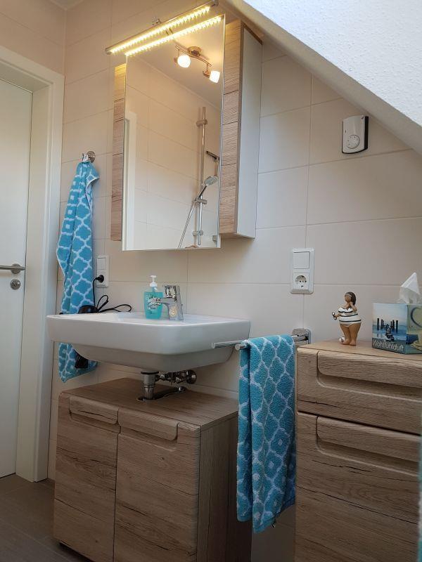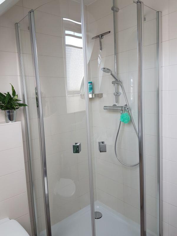 In dem Duschbad sind genügend Abstellmöglichkeiten für Ihre Badartikel vorhanden. Die Fußbodenheizung sorgt für ein angenehmes Wärmeempfinden nach der Dusche. Ein Föhn gehört selbstverständlich zur Ausstattung.
