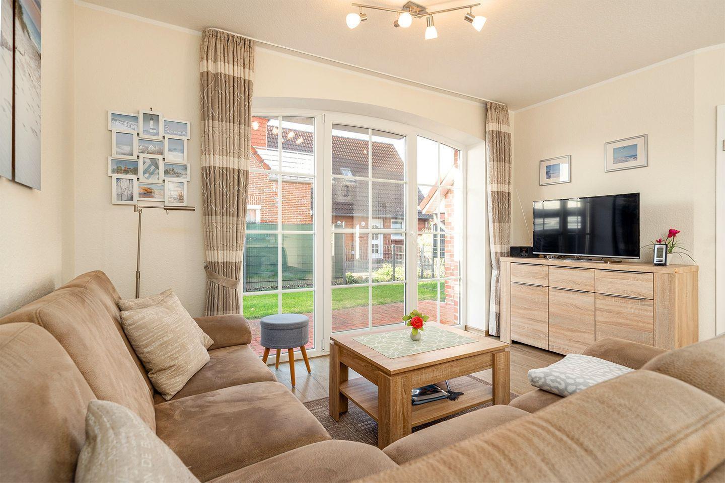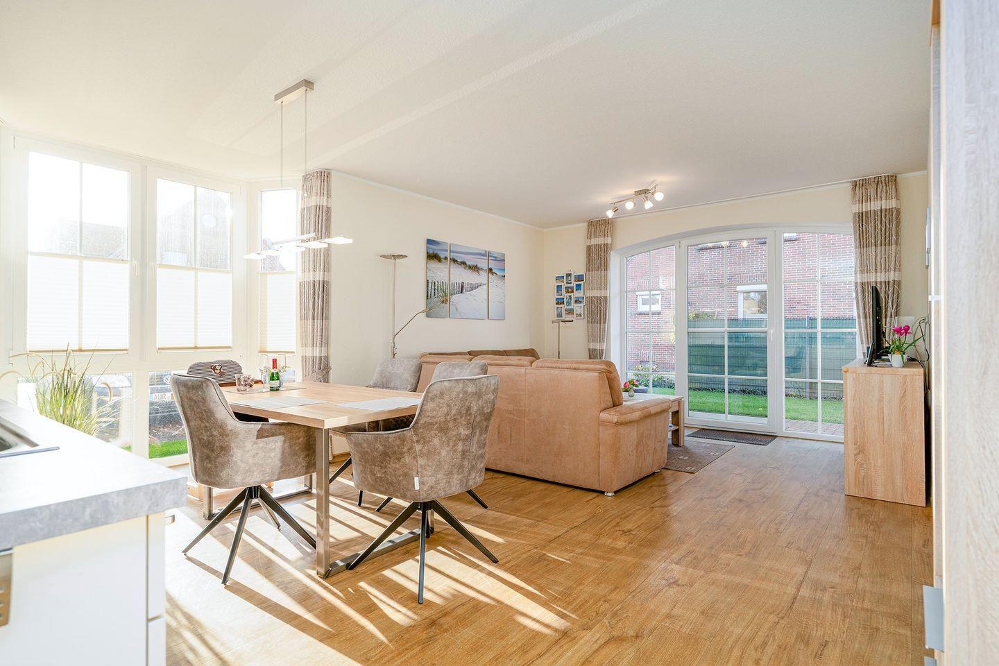 Der großzügige Wohn-Essbereich mit schönem Erker (mit Sichtschutz-Plissees und Vorhänge) lässt keine Wünsche offen: Die hochwertige Küche verfügt über Backofen, Mikrowelle, Kühl-/Gefrierkombination, Geschirrspülmaschine, Kaffeemaschine + Senseo, Eierkocher, Wasserkocher, Toaster, Mixer, u.v.m. Für Gäste, die die ostfriesische Gemütlichkeit mit einer Tasse Tee genießen möchten, steht ein komplettes Teeservice bereit.