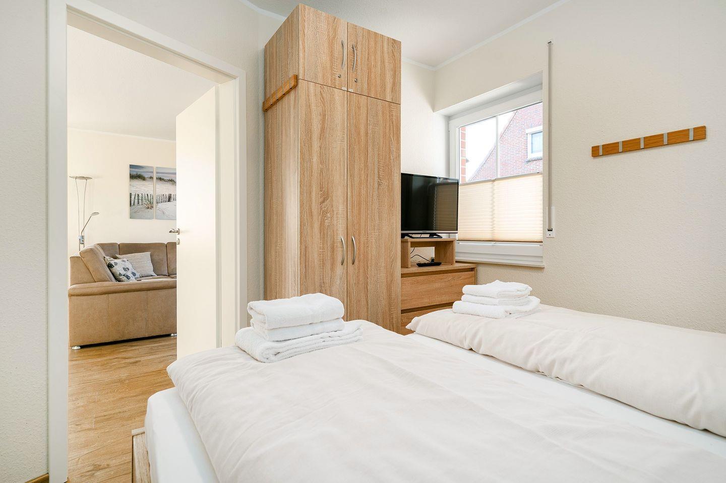 Es gibt 2 Schlafräume (1 x Doppelbett + 2 x Einzelbetten) mit Kleiderschrank und weiteren TV.