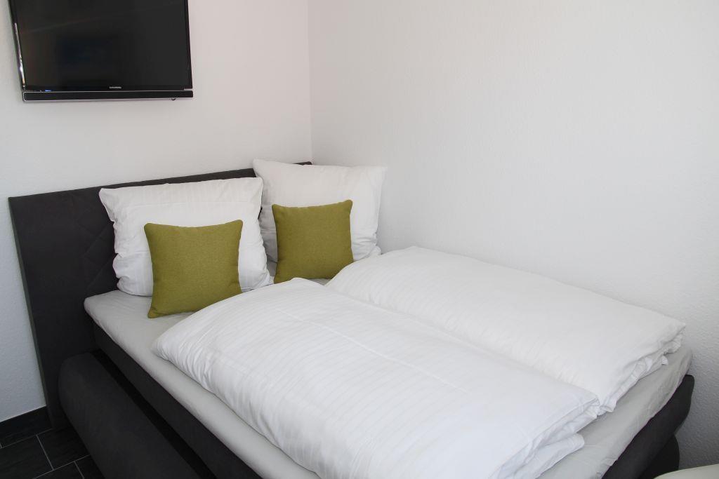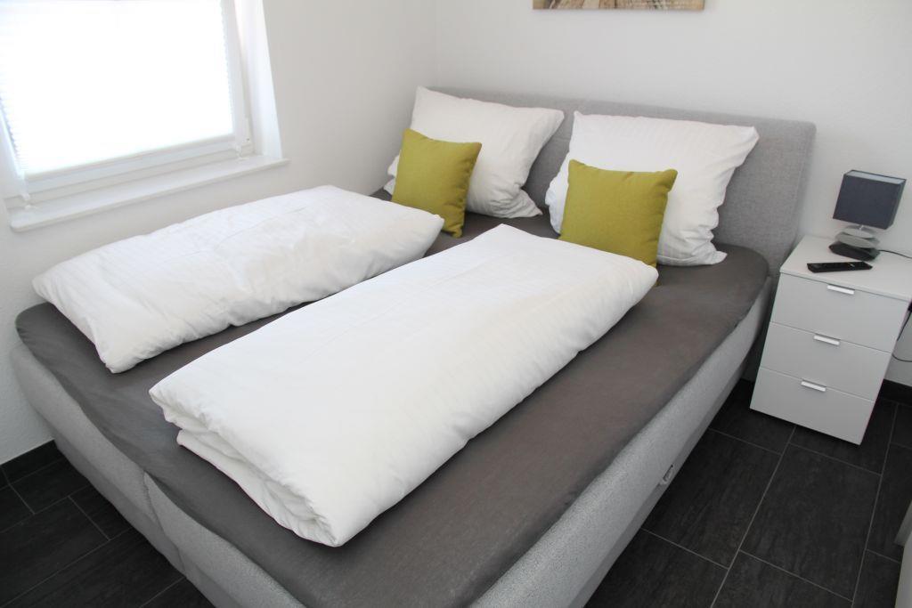 Es gibt zwei gemütliche Schlafräume mit 'Boxspring-Doppelbetten' (einmal 1,60 m Breite, durchgehende Matratze und einmal 1,80 m ebenfalls durchgehende Matratze) und TV. Die Schlafzimmer verfügen über Außenjalousien.