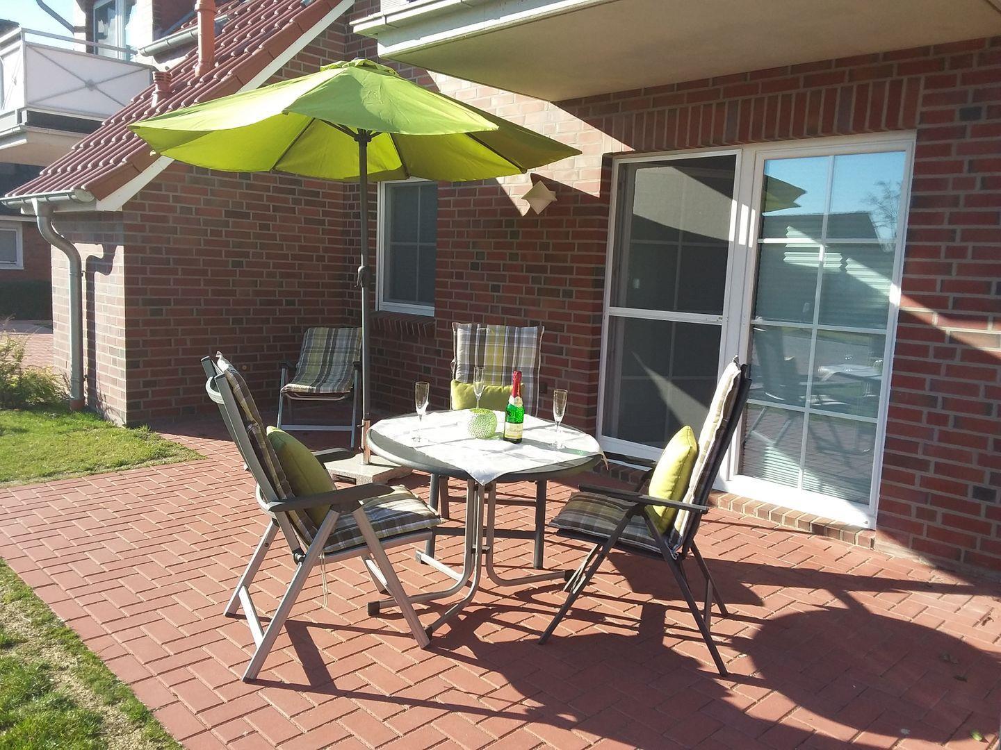 Ein kleiner Garten mit gemütlicher möblierter Terrasse und Sonnenschirm steht Ihnen für Sonnenstunden zur Verfügung.