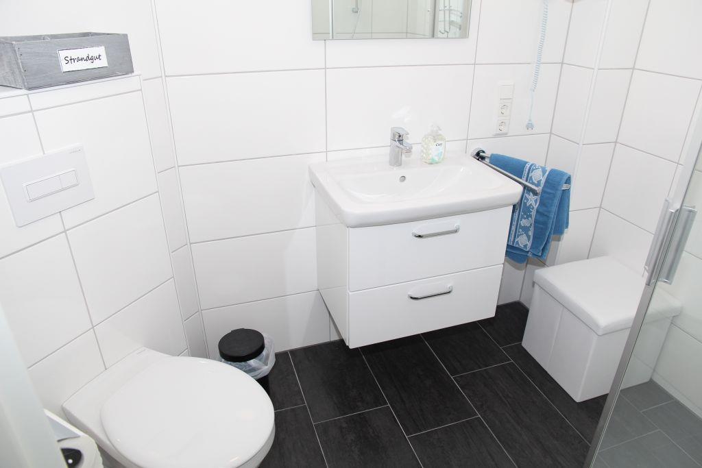 Das moderne Bad ist mit barrierefreier Dusche ausgestattet, ein Fön ist auch vorhanden.