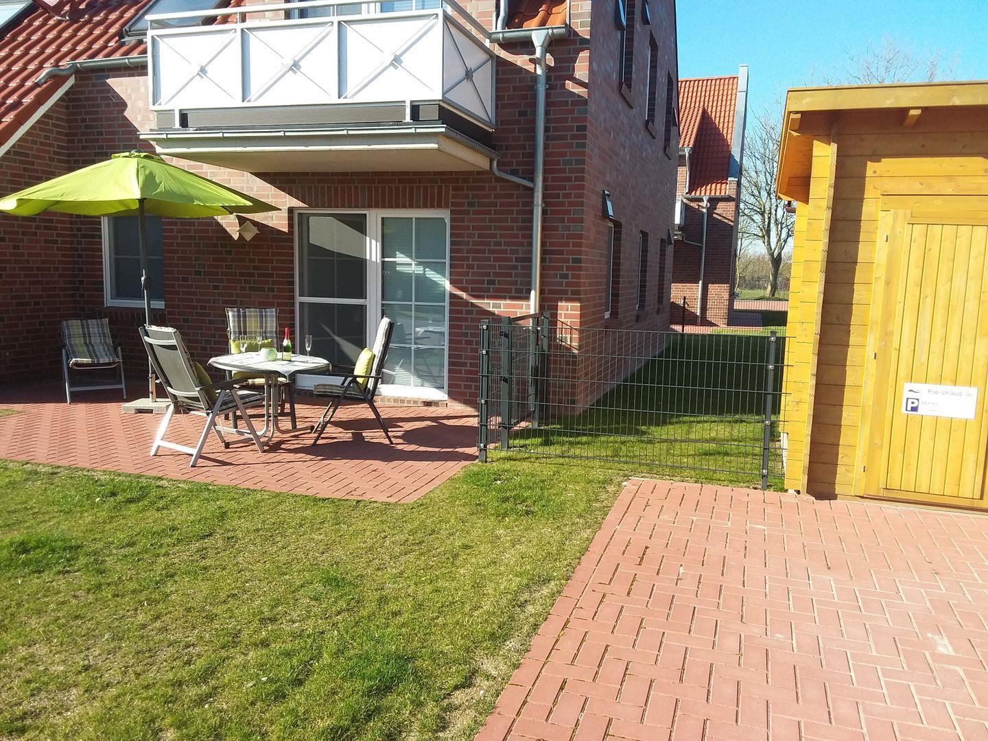 Gemütliche EG-Ferienwohnung in Greetsiel mit Terrasse, Nähe Zwillingsmühlen und Hafen, ideal für Familien und Hundebesitzer.