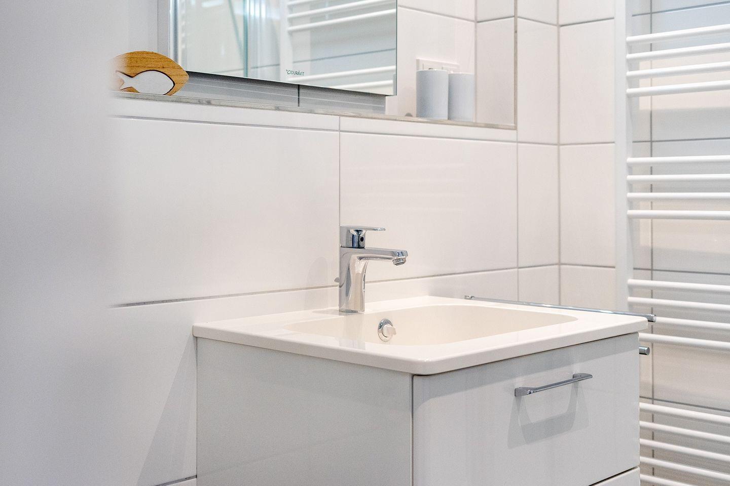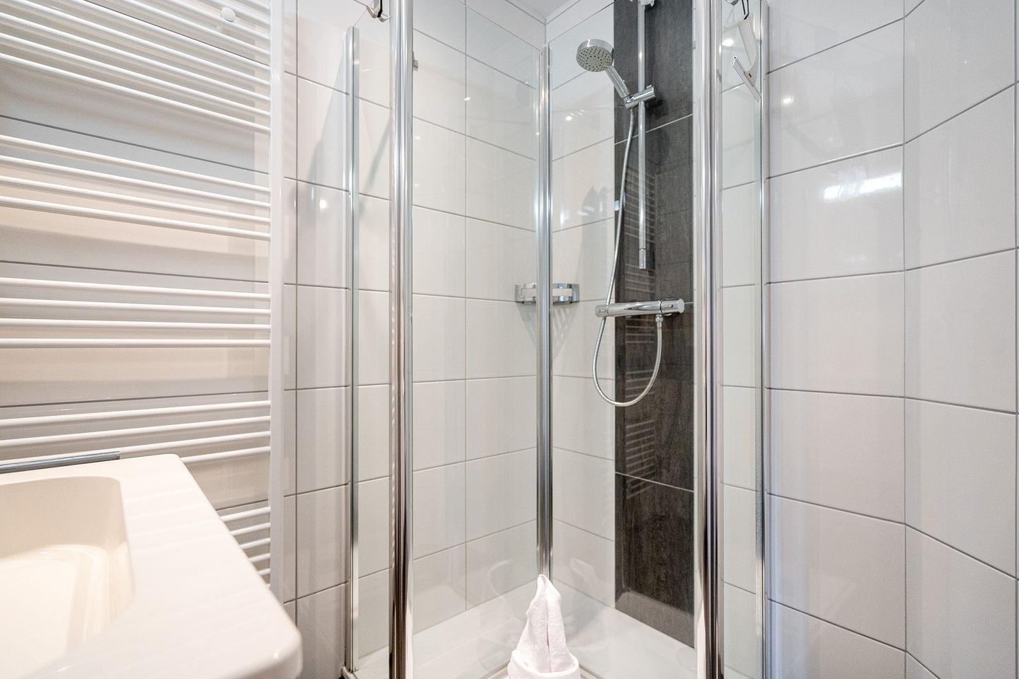 Das moderne Bad ist mit einer Dusche mit minimalem Einstieg und einem Handtuchwärmer ausgestattet, ein Fön ist auch vorhanden. Ein Waschtrockner steht Ihnen kostenlos zur Verfügung.