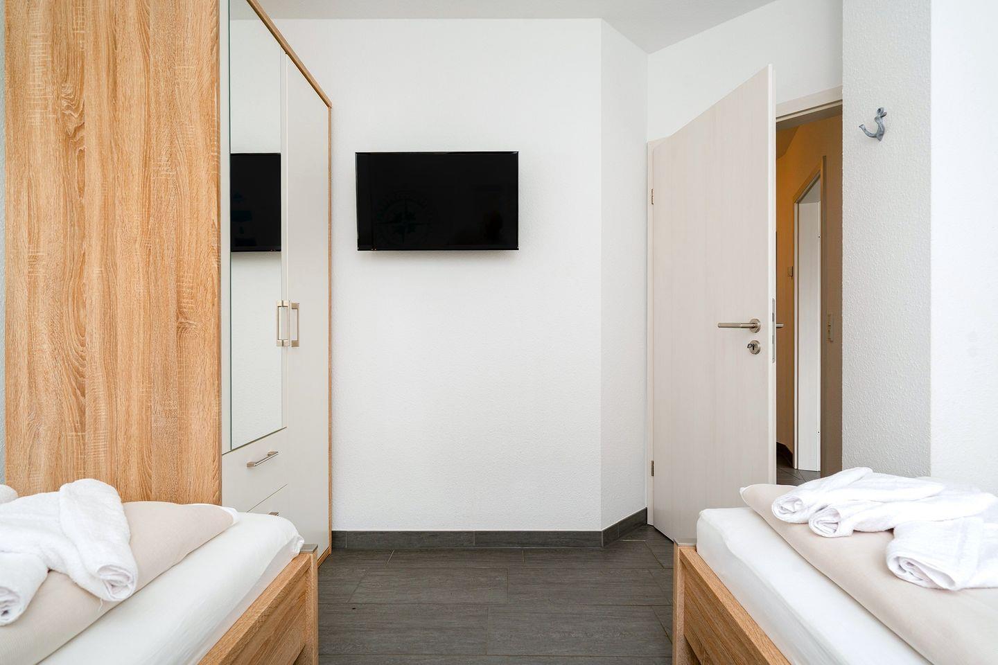 Es gibt zwei gemütliche Schlafräume mit einem Doppelbett bzw. zwei Einzelbetten und TV, der als Smart-TV nutzbar ist. Die Schlafzimmer verfügen beide über elektrische Außenjalousien.